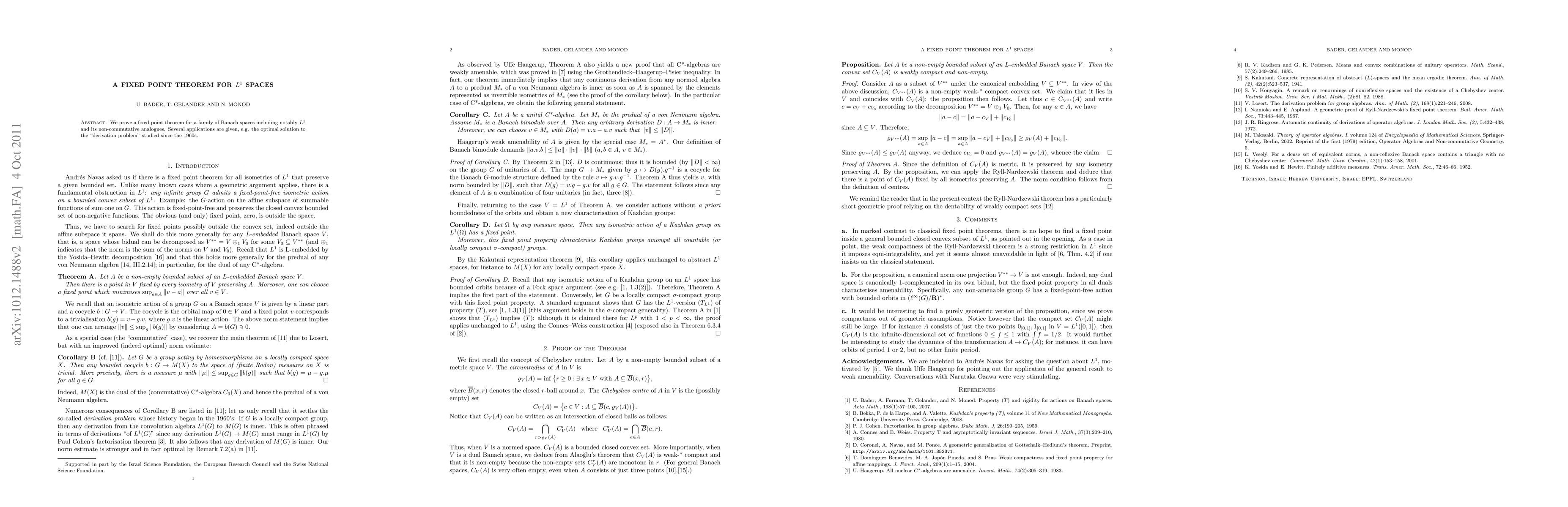 This paper establishes a fixed point theorem applicable to L^1 spaces and their non-commutative versions, with applications notably resolving the longstanding "derivation problem." The theorem provides a foundational result for various functional analysis problems.