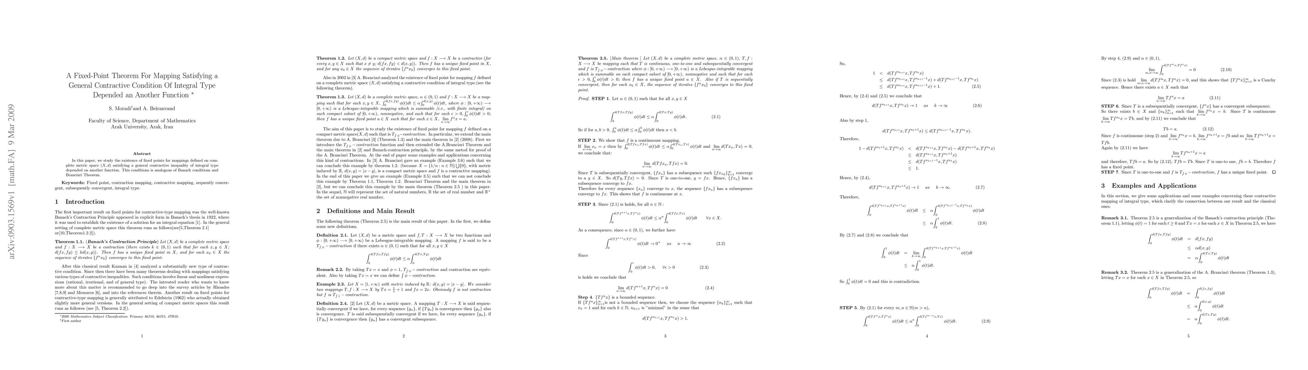 Researchers developed a fixed-point theorem for mappings on complete metric spaces that satisfy a general contractive condition, analogous to Banach conditions and Branciari Theorem, providing insight into the existence of fixed points for integral-type dependent functions.