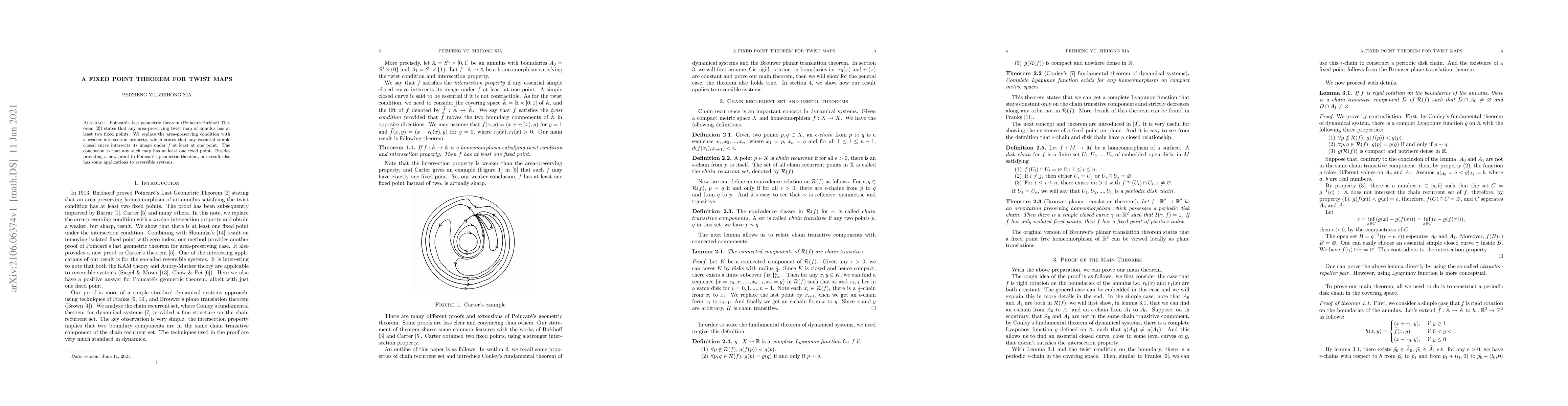 The paper proves a fixed point theorem for twist maps by relaxing the area-preserving condition to a weaker intersection property, demonstrating that any such map has at least one fixed point, providing a new proof for Poincare's geometric theorem and offering applications to reversible systems.