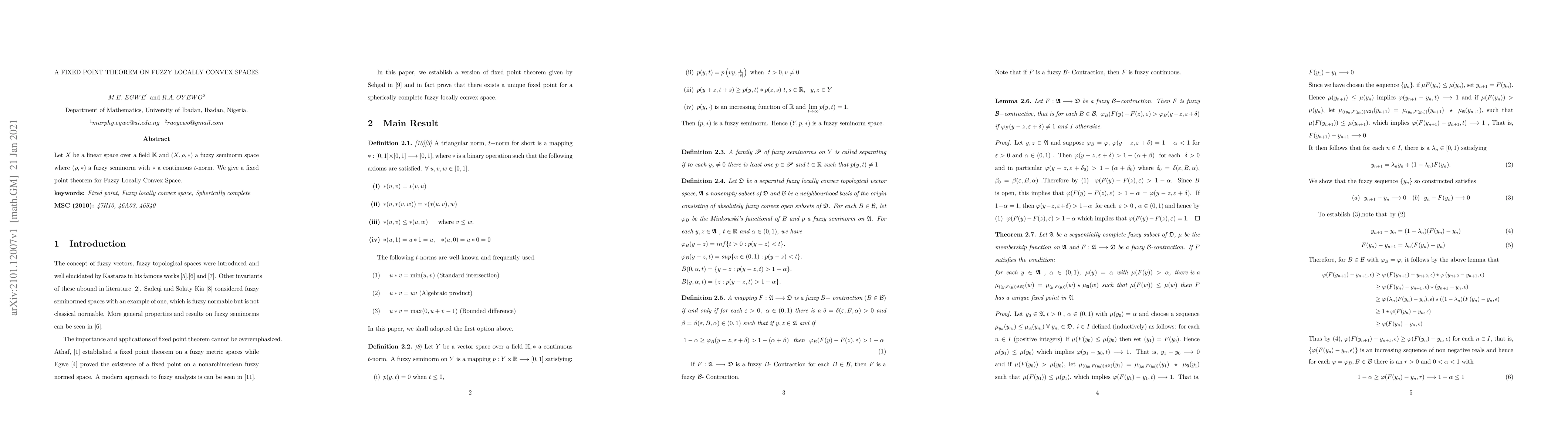 This paper presents a fixed point theorem in the context of fuzzy locally convex spaces, establishing conditions under which a mapping has a fixed point in a fuzzy seminorm space equipped with a continuous $t$-norm.