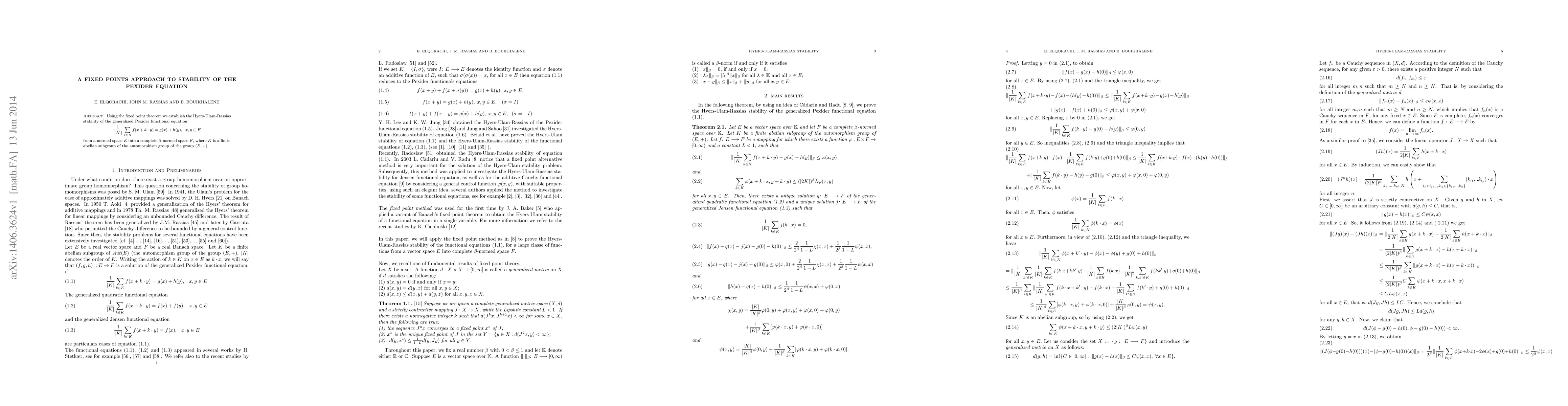 This paper utilizes the fixed point theorem to prove the Hyers-Ulam-Rassias stability of the generalized Pexider functional equation in normed spaces, establishing the equation's stability under specific conditions involving a finite abelian subgroup and a complete β-normed space.