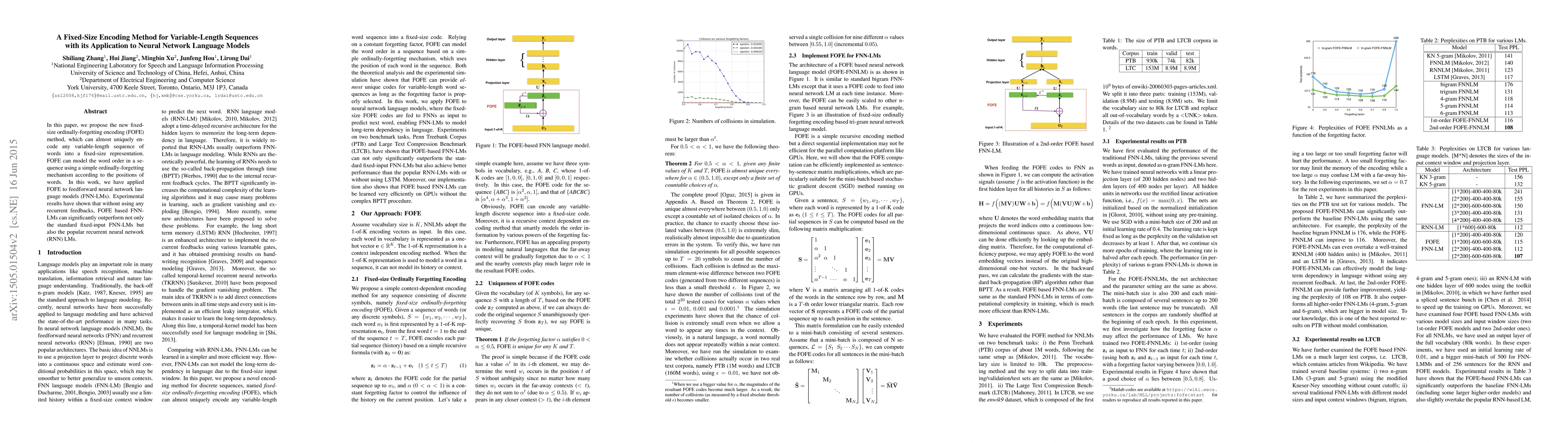 In this paper, we propose the new fixed-size ordinally-forgetting encoding (FOFE) method, which can almost uniquely encode any variable-length sequence of words into a fixed-size representation. FOFE can model the word order in a sequence using a simple ordinally-forgetting mechanism according to the positions of words. In this work, we have applied FOFE to feedforward neural network language models (FNN-LMs). Experimental results have shown that without using any recurrent feedbacks, FOFE based FNN-LMs can significantly outperform not only the standard fixed-input FNN-LMs but also the popular RNN-LMs.