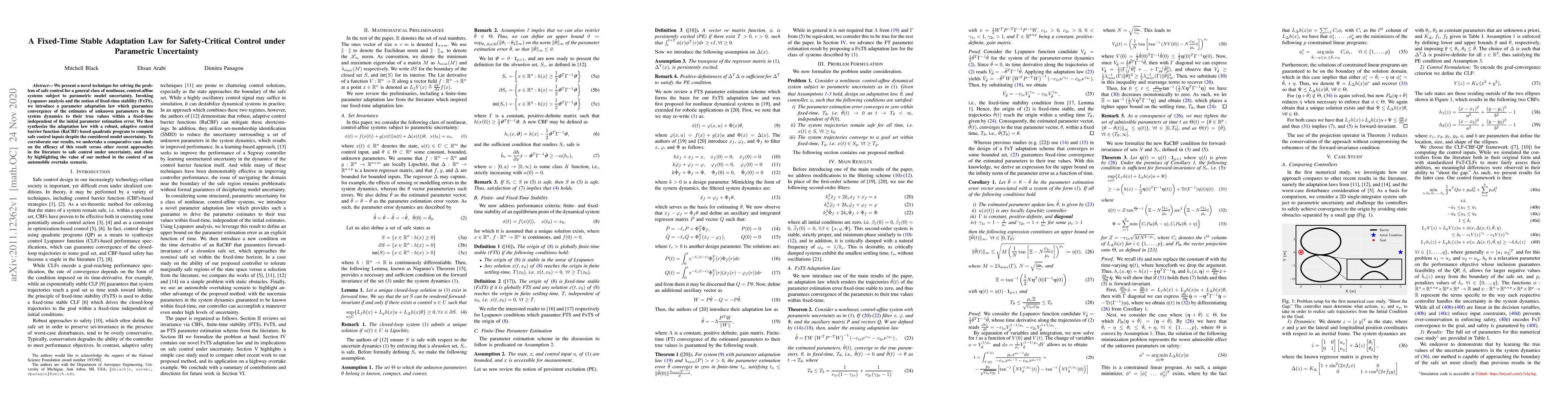 This paper introduces a fixed-time stable adaptation law for safe control of nonlinear systems under parametric uncertainty, ensuring parameter estimates converge within a fixed time. It combines this with a robust adaptive control barrier function to compute safe control inputs, demonstrating its effectiveness through a comparative case study on an automobile overtake scenario.
