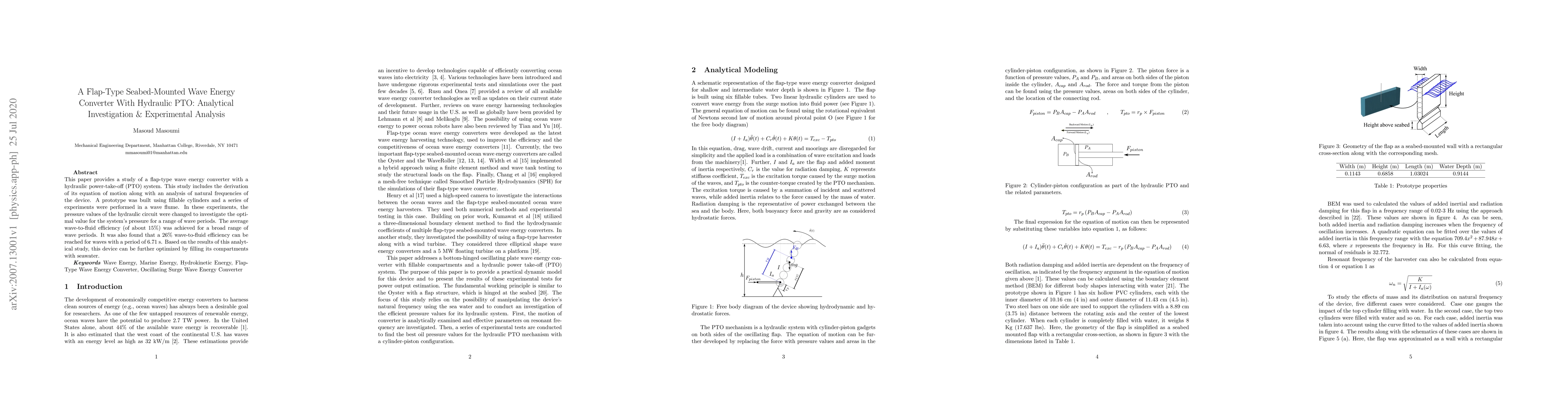 This paper investigates a flap-type seabed-mounted wave energy converter with a hydraulic power-take-off system, deriving its equation of motion and analyzing natural frequencies. Experimental results in a wave flume show an average wave-to-fluid efficiency of 15%, with a peak efficiency of 26% for waves of 6.71 s period.