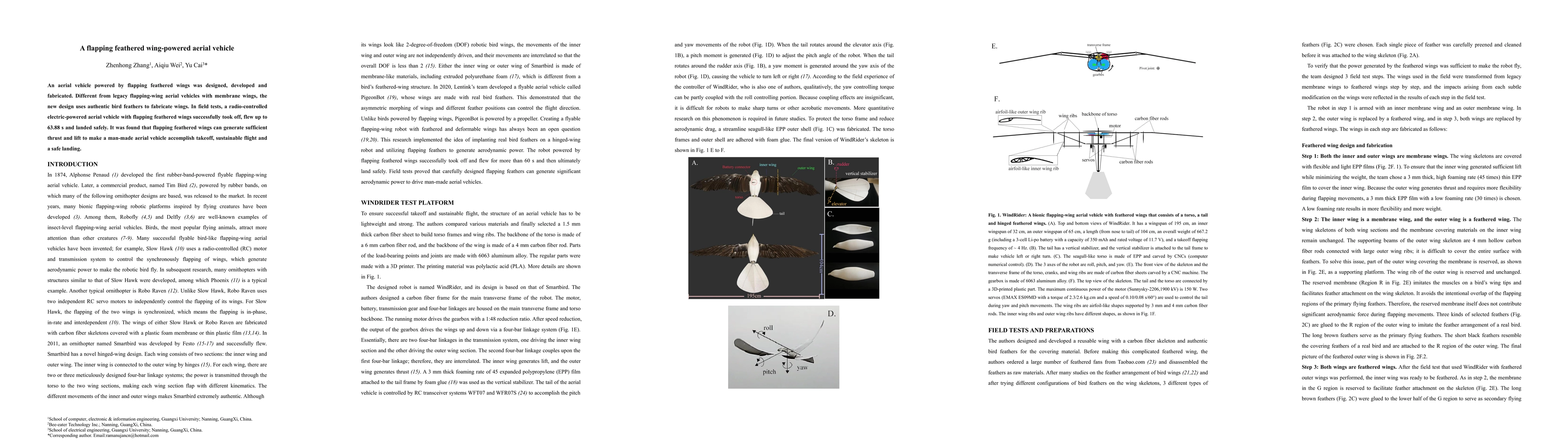 This study presents a novel aerial vehicle powered by flapping wings made from authentic bird feathers, successfully achieving takeoff, sustained flight for 63.88 seconds, and safe landing, demonstrating the potential of feather-based designs for flight.