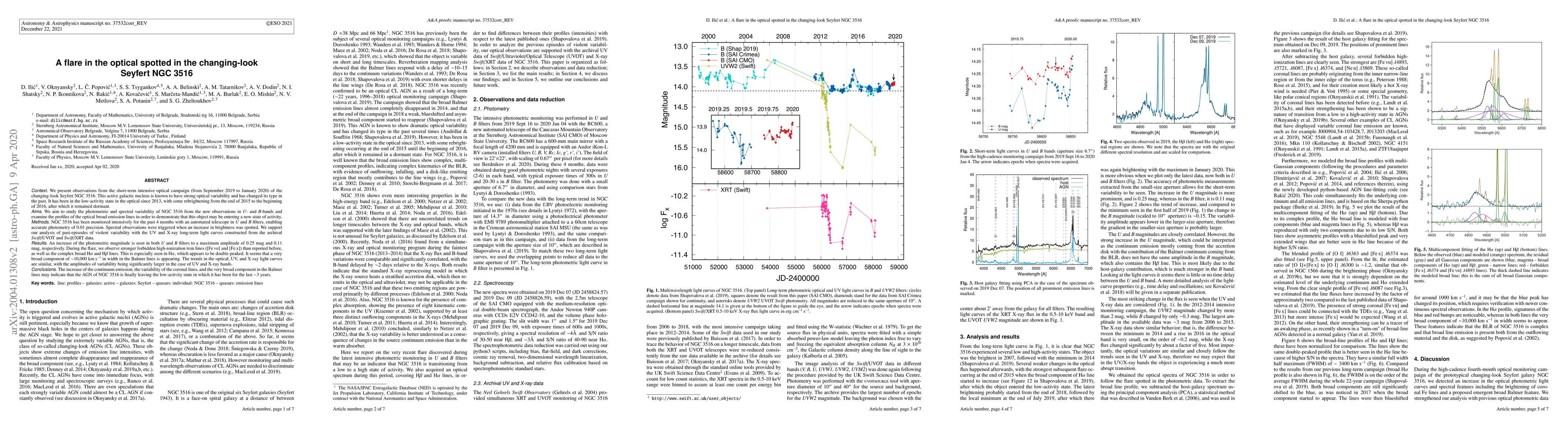 We present observations from the short-term intensive optical campaign (from Sep2019 to Jan2020) of the changing-look Seyfert NGC 3516. This active galactic nucleus is known to have strong optical variability and has changed its type in the past. It has been in the low-activity state in the optical since 2013, with some rebrightening from the end of 2015 to the beginning of 2016, after which it remained dormant. We aim to study the photometric and spectral variability of NGC 3516 from the new observations in U- and B-bands and examine the profiles of the optical broad emission lines in order to demonstrate that this object may be entering a new state of activity. NGC 3516 has been monitored intensively for the past 4 months with an automated telescope in U and B filters, enabling accurate photometry of 0.01 precision. Spectral observations were triggered when an increase in brightness was spotted. We support our analysis of past-episodes of violent variability with the UV and X-ray long-term light curves constructed from the archival Swift data. An increase of the photometric magnitude is seen in both U and B filters to a maximum amplitude of 0.25mag and 0.1 mag, respectively. During the flare, we observe stronger forbidden high-ionization iron lines than reported before, as well as the complex broad Ha and Hb lines. This is especially seen in Ha which appears to be double-peaked. It seems that a very broad component of ~10,000 km/s in width in the Balmer lines is appearing. The trends in the optical, UV, and X-ray light curves are similar, with the amplitudes of variability being significantly larger in the case of UV and X-ray bands. The increase of the continuum emission, the variability of the coronal lines, and the very broad component in the Balmer lines may indicate that the AGN of NGC 3516 is finally leaving the low-activity state in which it has been for the last ~3 years.
