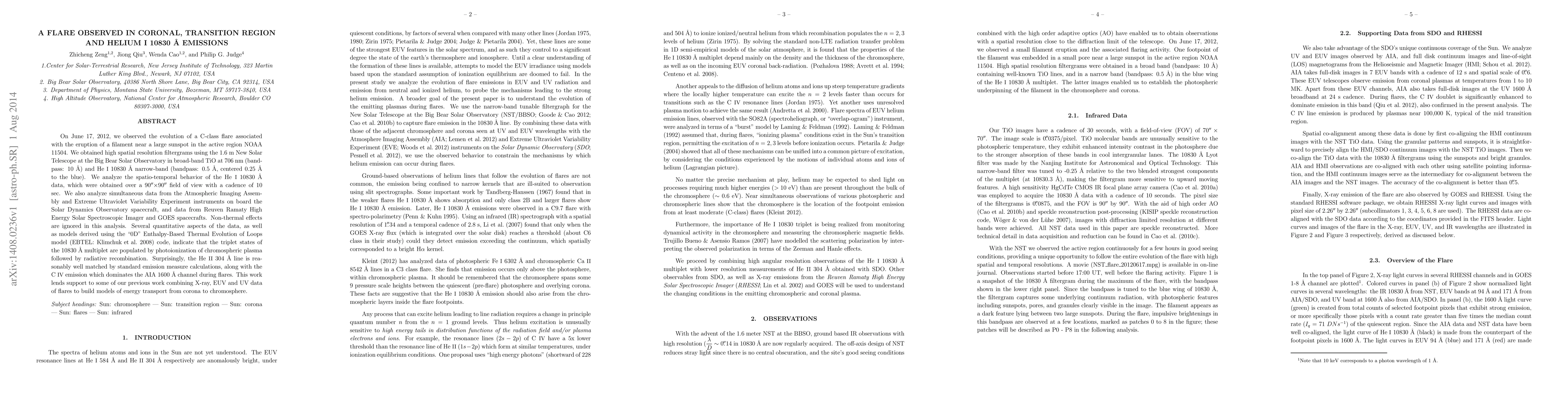 On June 17, 2012, we observed the evolution of a C-class flare associated with the eruption of a filament near a large sunspot in the active region NOAA 11504. We obtained high spatial resolution filtergrams using the 1.6 m New Solar Telescope at the Big Bear Solar Observatory in broad-band TiO at 706 nm (bandpass:10 \AA) and He I 10830 \AA\ narrow-band (bandpass: 0.5 \AA, centered 0.25 \AA\ to the blue). We analyze the spatio-temporal behavior of the He I 10830 \AA\ data, which were obtained over a 90" X 90" field of view with a cadence of 10 sec. We also analyze simultaneous data from the Atmospheric Imaging Assembly and Extreme Ultraviolet Variability Experiment instruments on board the Solar Dynamics Observatory spacecraft, and data from Reuven Ramaty High Energy Solar Spectroscopic Imager and GOES spacecrafts. Non-thermal effects are ignored in this analysis. Several quantitative aspects of the data, as well as models derived using the "0D" Enthalpy-Based Thermal Evolution of Loops model (EBTEL: Klimchuk et al. 2008) code, indicate that the triplet states of the 10830 \AA\ multiplet are populated by photoionization of chromospheric plasma followed by radiative recombination. Surprisingly, the He II 304 \AA\ line is reasonably well matched by standard emission measure calculations, along with the C IV emission which dominates the AIA 1600 \AA\ channel during flares. This work lends support to some of our previous work combining X-ray, EUV and UV data of flares to build models of energy transport from corona to chromosphere.