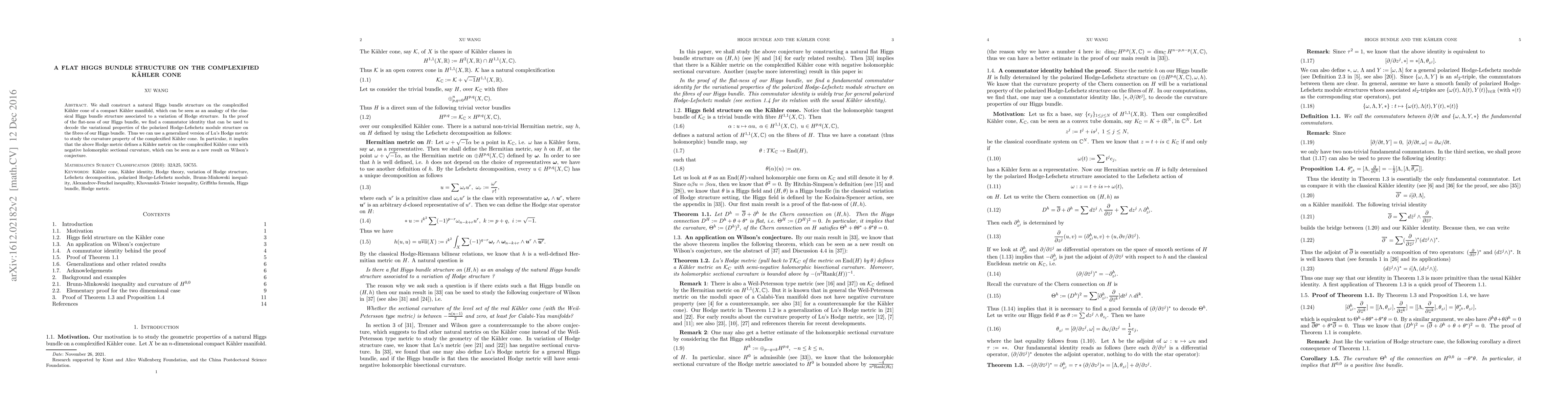 We shall construct a natural Higgs bundle structure on the complexified K\"ahler cone of a compact K\"ahler manifold, which can be seen as an analogy of the classical Higgs bundle structure associated to a variation of Hodge structure. In the proof of the flat-ness of our Higgs bundle, we find a commutator identity that can be used to decode the variational properties of the polarized Hodge-Lefschetz module structure on the fibres of our Higgs bundle. Thus we can use a generalized version of Lu's Hodge metric to study the curvature property of the complexified K\"ahler cone. In particular, it implies that the above Hodge metric defines a K\"ahler metric on the complexified K\"ahler cone with negative holomorphic sectional curvature, which can be seen as a new result on Wilson's conjecture.