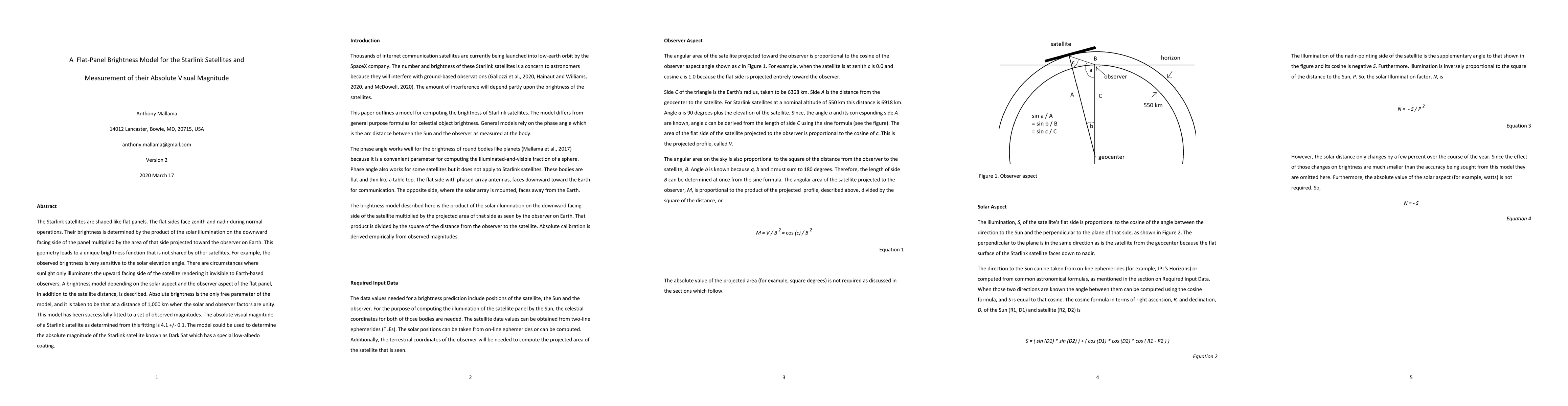 This paper develops a unique brightness model for Starlink satellites, shaped as flat panels, which considers solar and observer angles, and satellite distance. The model determines the absolute visual magnitude of a typical Starlink satellite as 4.1 +/- 0.1, and could also apply to the low-albedo Dark Sat.
