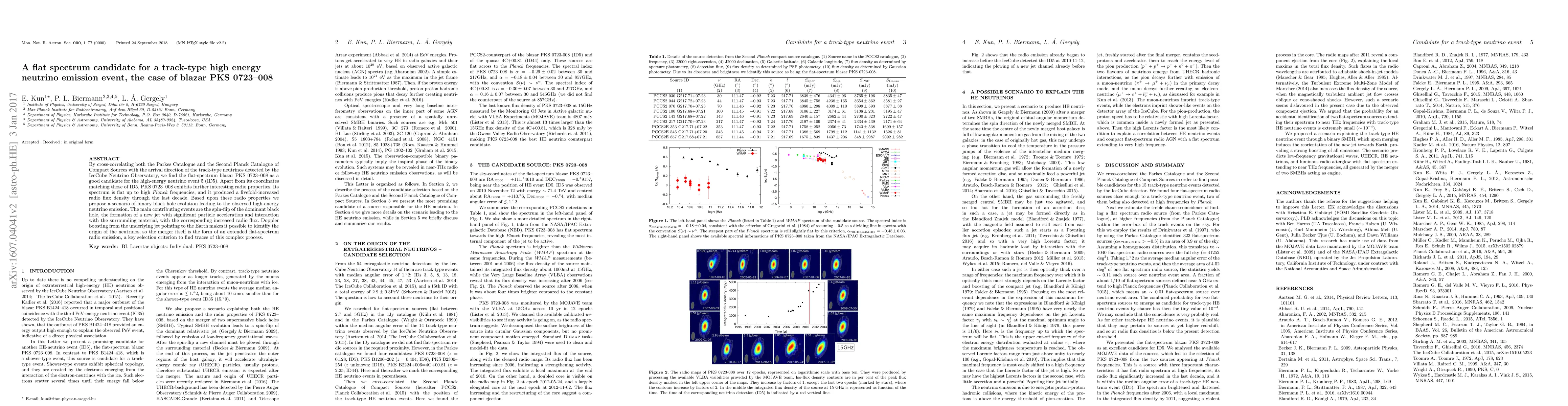 By cross-correlating both the Parkes Catalogue and the Second Planck Catalogue of Compact Sources with the arrival direction of the track-type neutrinos detected by the IceCube Neutrino Observatory, we find the flat-spectrum blazar PKS 0723-008 as a good candidate for the high-energy neutrino event 5 (ID5). Apart from its coordinates matching those of ID5, PKS 0723-008 exhibits further interesting radio properties. Its spectrum is flat up to high Planck frequencies, and it produced a fivefold-increased radio flux density through the last decade. Based upon these radio properties we propose a scenario of binary black hole evolution leading to the observed high-energy neutrino emission. The main contributing events are the spin-flip of the dominant black hole, the formation of a new jet with significant particle acceleration and interaction with the surrounding material, with the corresponding increased radio flux. Doppler boosting from the underlying jet pointing to the Earth makes it possible to identify the origin of the neutrinos, so the merger itself is the form of an extended flat-spectrum radio emission, a key selection criterion to find traces of this complex process.
