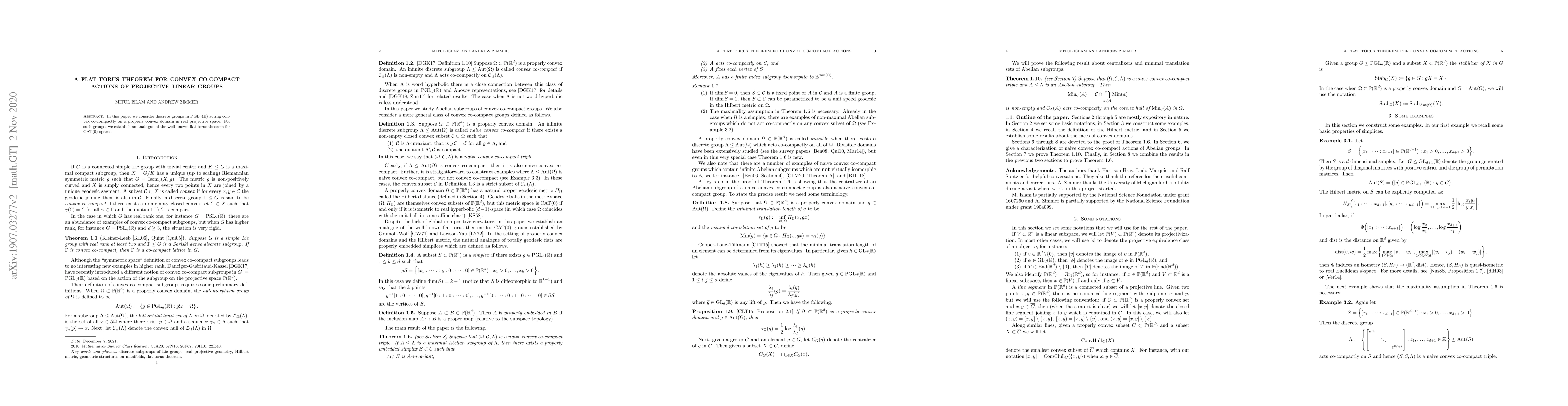 This paper establishes an analogue of the flat torus theorem for convex co-compact actions of projective linear groups on properly convex domains in real projective space, extending the classical result from CAT(0) spaces.
