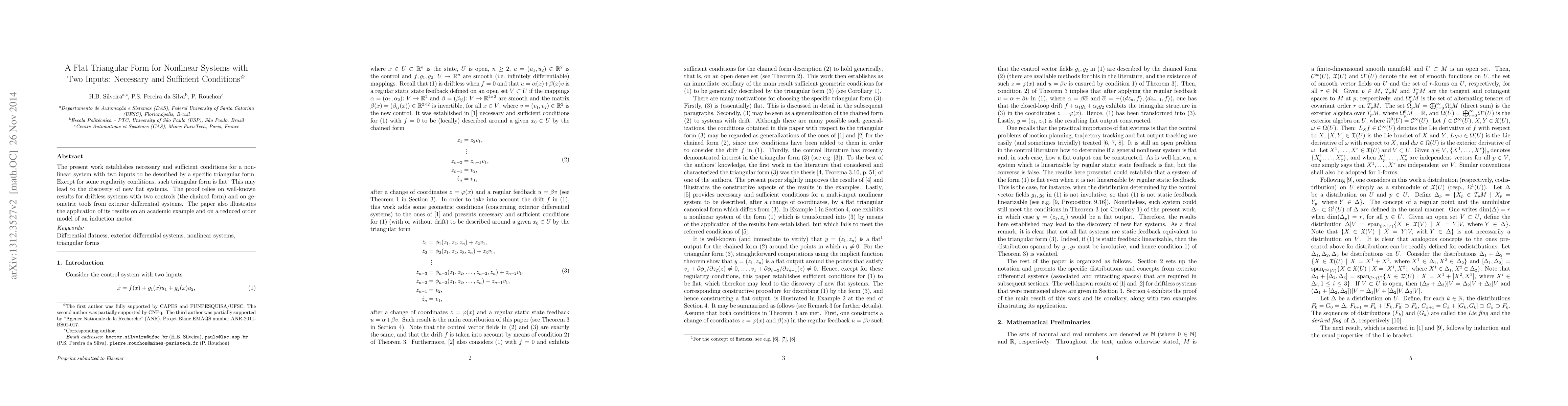 Researchers establish a condition for nonlinear systems with two inputs to be described by a specific triangular form, which may lead to the discovery of new flat systems.
