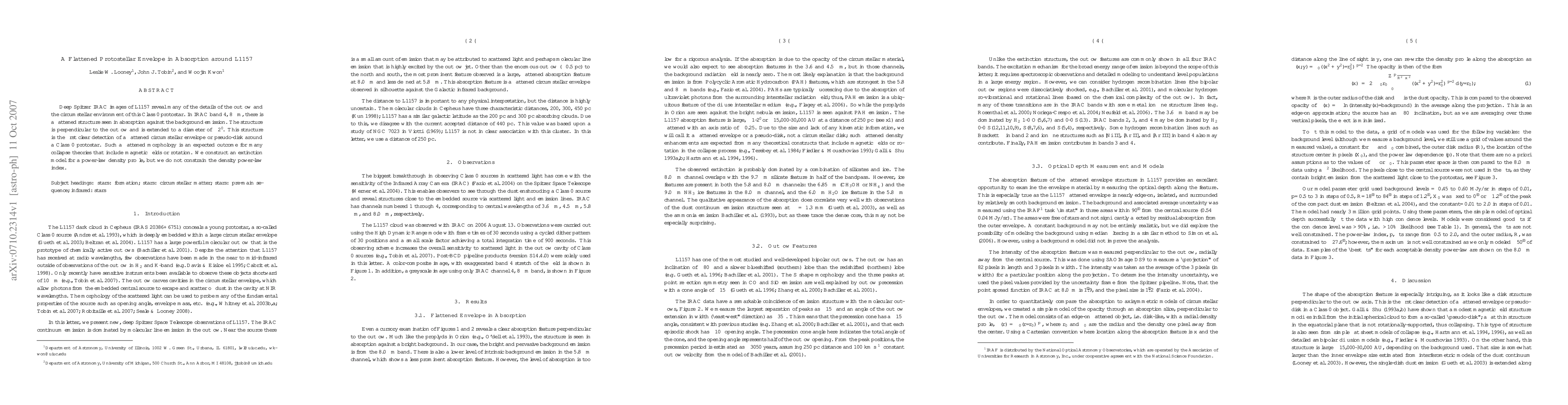Deep Spitzer IRAC images of L1157 reveal many of the details of the outflow and the circumstellar environment of this Class 0 protostar. In IRAC band 4, 8 microns, there is a flattened structure seen in absorption against the background emission. The structure is perpendicular to the outflow and is extended to a diameter of 2 arcminutes. This structure is the first clear detection of a flattened circumstellar envelope or pseudo-disk around a Class 0 protostar. Such a flattened morphology is an expected outcome for many collapse theories that include magnetic fields or rotation. We construct an extinction model for a power-law density profile, but we do not constrain the density power-law index.