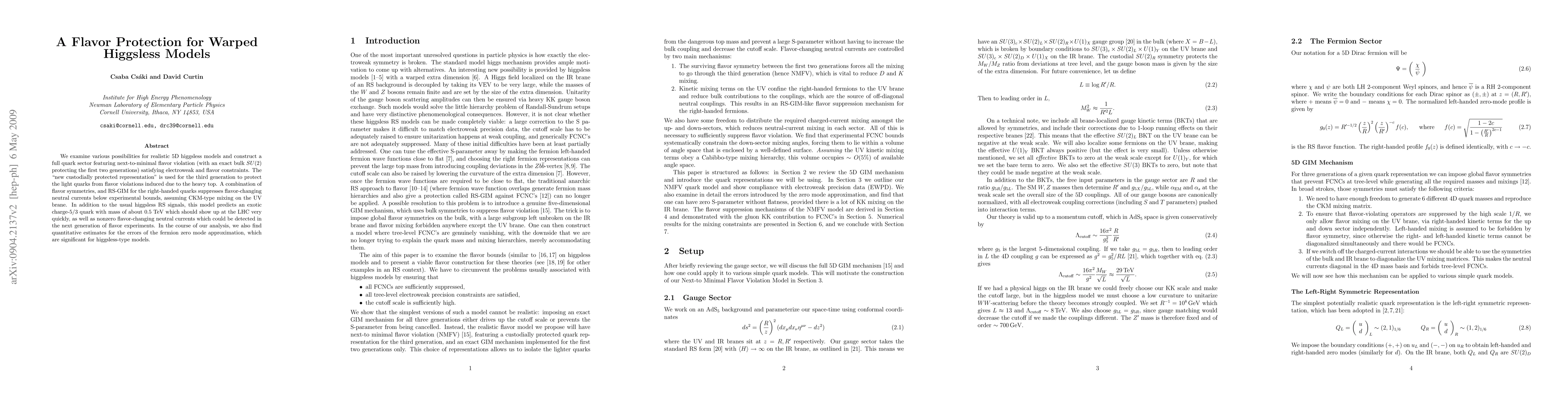 This paper constructs a flavor-protected 5D higgsless model with exact SU(2) symmetry for the first two quark generations and a new custodially protected representation for the third, predicting a charge-5/3 quark at the LHC and nonzero flavor-changing neutral currents detectable in future experiments. It also evaluates the errors in the fermion zero mode approximation for such models.