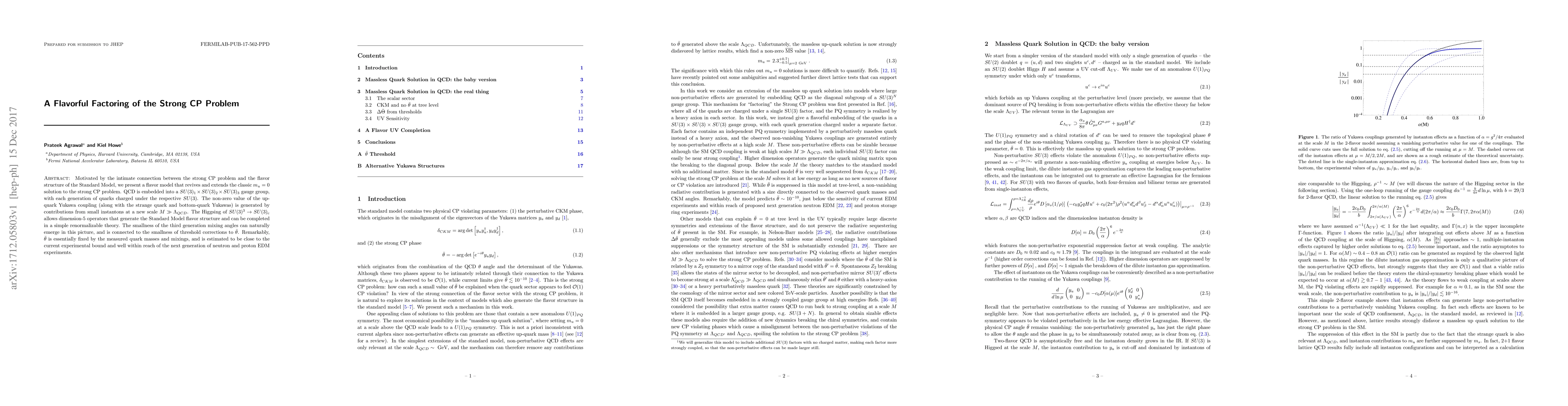 This paper proposes a flavor model to address the strong CP problem by embedding QCD within a larger gauge group, generating non-zero up-quark Yukawa coupling through instanton contributions, and naturally explaining the smallness of third-generation mixing angles. The solution predicts $\bar\theta$ near current experimental bounds, potentially verifiable by future EDM experiments.