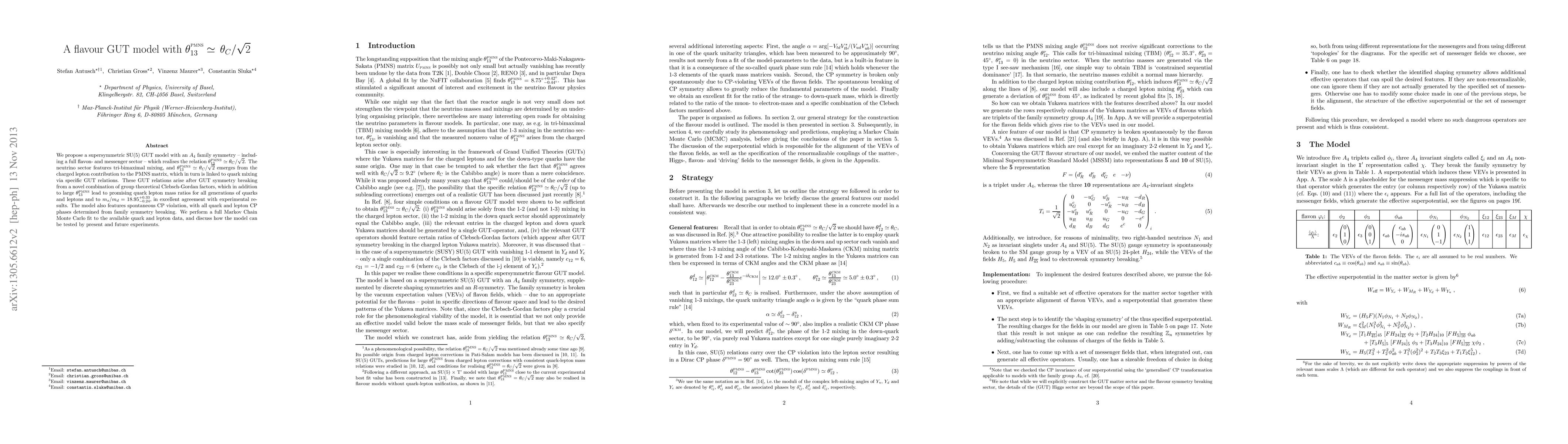 We propose a supersymmetric SU(5) GUT model with an A_4 family symmetry - including a full flavon- and messenger sector - which realises the relation theta_13^PMNS \simeq theta_C / sqrt(2). The neutrino sector features tri-bimaximal mixing, and theta_13^PMNS \simeq theta_C / sqrt(2) emerges from the charged lepton contribution to the PMNS matrix, which in turn is linked to quark mixing via specific GUT relations. These GUT relations arise after GUT symmetry breaking from a novel combination of group theoretical Clebsch-Gordan factors, which in addition to large theta_13^PMNS lead to promising quark lepton mass ratios for all generations of quarks and leptons and to m_s / m_d = 18.95_(-0.24)^(+0.33), in excellent agreement with experimental results. The model also features spontaneous CP violation, with all quark and lepton CP phases determined from family symmetry breaking. We perform a full Markov Chain Monte Carlo fit to the available quark and lepton data, and discuss how the model can be tested by present and future experiments.