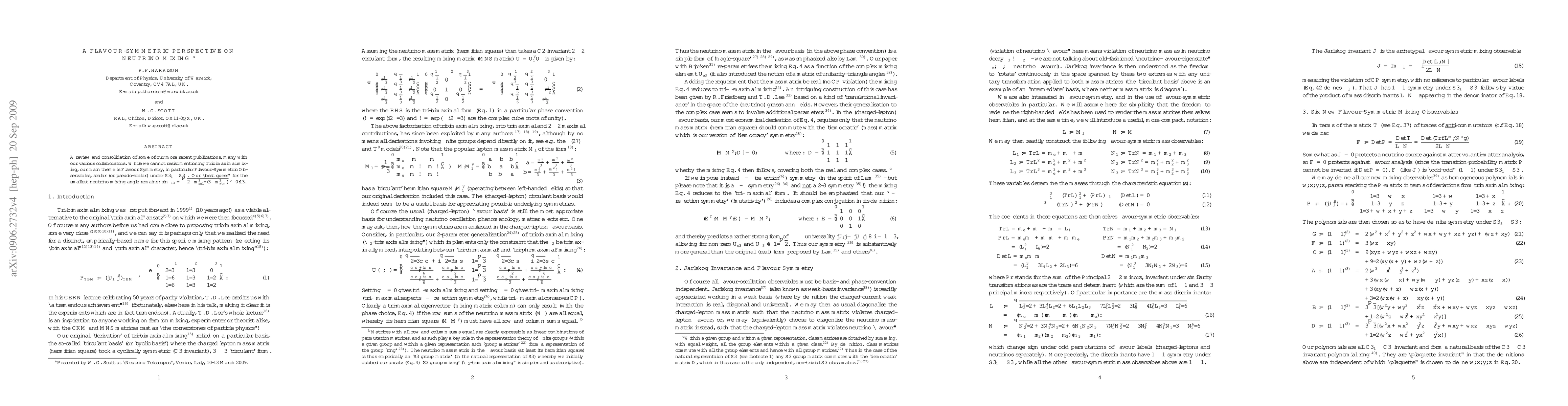 A review and consolidation of some of our more recent publications, many with our various collaborators. While we cannot resist mentioning Tribimaximal mixing, our main theme is Flavour Symmetry, in particular Flavour-Symmetric Observables, scalar (or pseudo-scalar) under $S3_l \times S3_{\nu}$. Our "best guess" for the smallest neutrino mixing angle remains: $\sin \theta_{13}=\sqrt{2 \Delta m^2_{sol}/(3 \Delta m^2_{atm})} \simeq 0.13$.