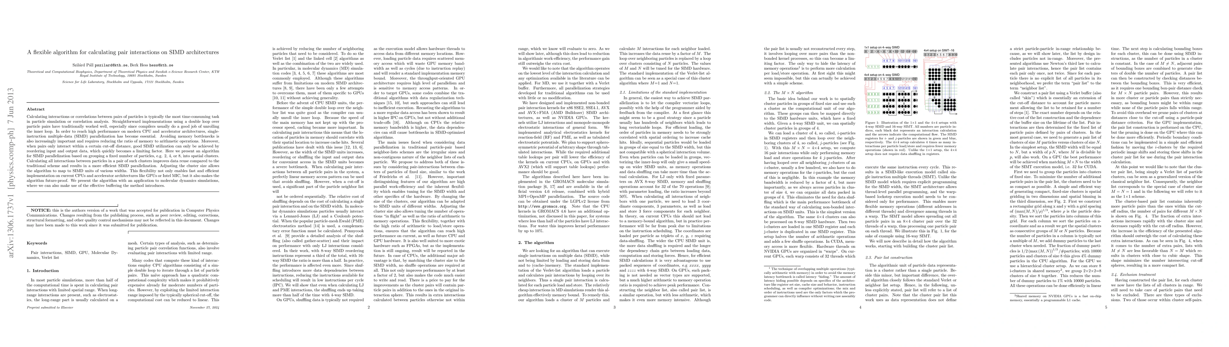This paper proposes a flexible algorithm for efficiently calculating pair interactions on SIMD architectures, optimizing performance by grouping particles into spatial clusters and improving data reuse. The algorithm's adaptability to different SIMD widths ensures its effectiveness on current and future CPU and accelerator architectures.