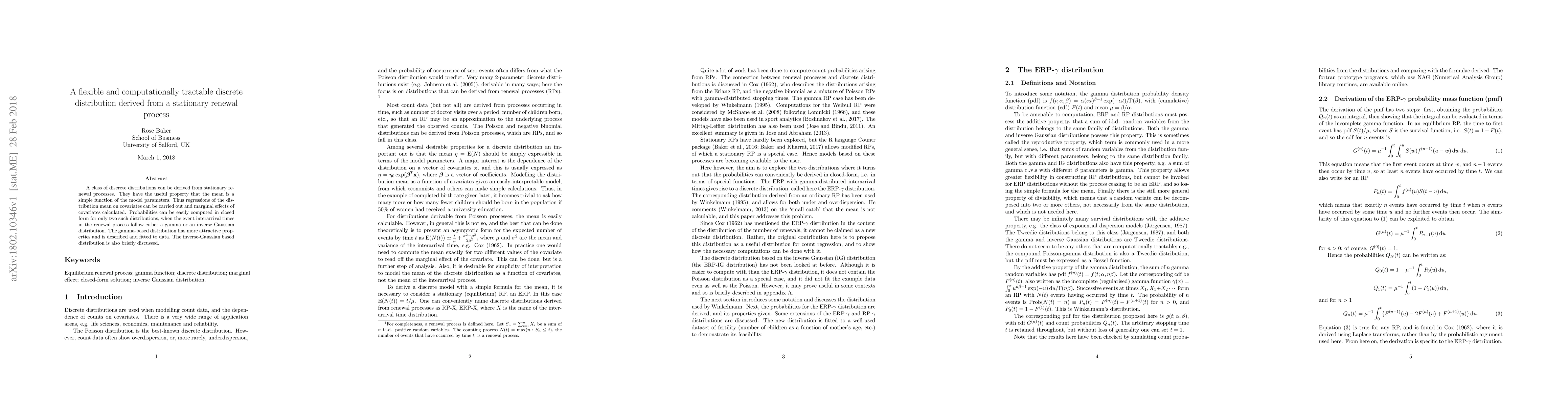 A class of discrete distributions can be derived from stationary renewal processes. They have the useful property that the mean is a simple function of the model parameters. Thus regressions of the distribution mean on covariates can be carried out and marginal effects of covariates calculated. Probabilities can be easily computed in closed form for only two such distributions, when the event interarrival times in the renewal process follow either a gamma or an inverse Gaussian distribution. The gamma-based distribution has more attractive properties and is described and fitted to data. The inverse-Gaussian based distribution is also briefly discussed.