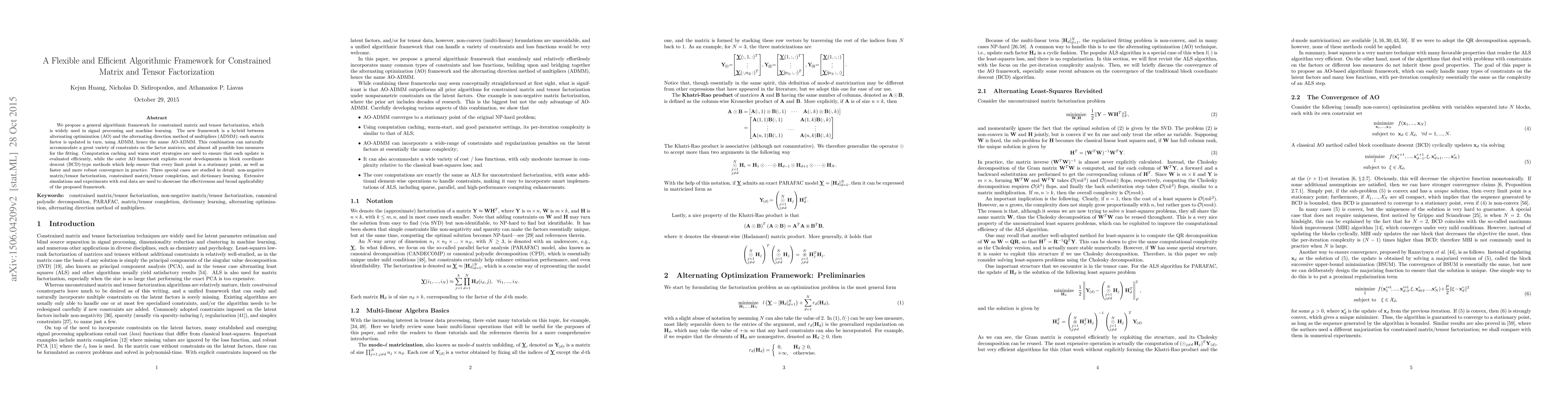 A new algorithmic framework for constrained matrix and tensor factorization is proposed, combining alternating optimization and ADMM to efficiently accommodate various constraints and loss measures.
