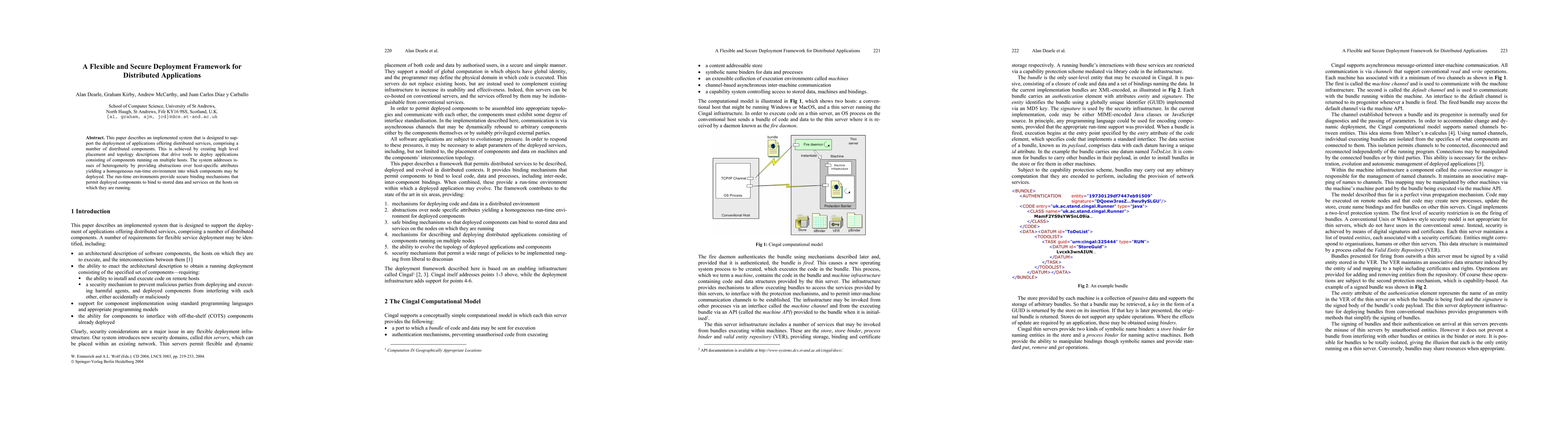 This paper presents a flexible deployment framework for distributed applications, enabling secure and heterogeneous component placement across multiple hosts through high-level descriptions and abstractions. It ensures secure binding of components to data and services on their respective hosts.