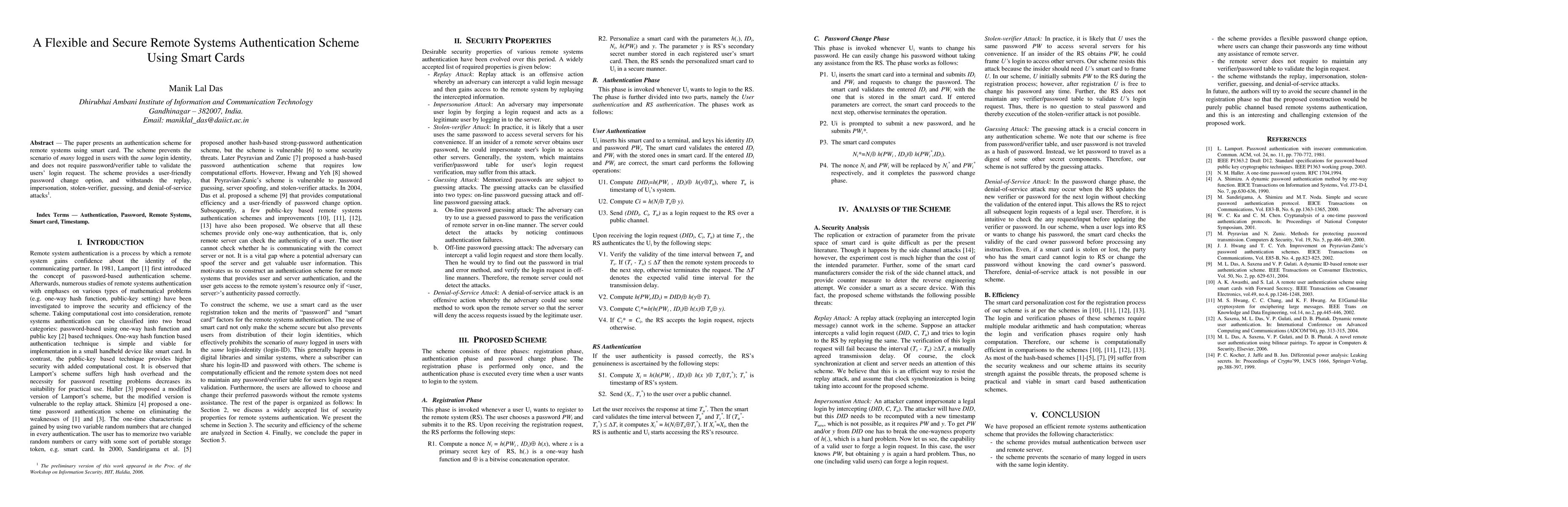 This paper proposes a secure remote authentication scheme utilizing smart cards to prevent multiple users from sharing the same login identity without needing password/verifier tables. It also offers a user-friendly password change mechanism and effectively defends against various attacks including replay, impersonation, and denial-of-service.