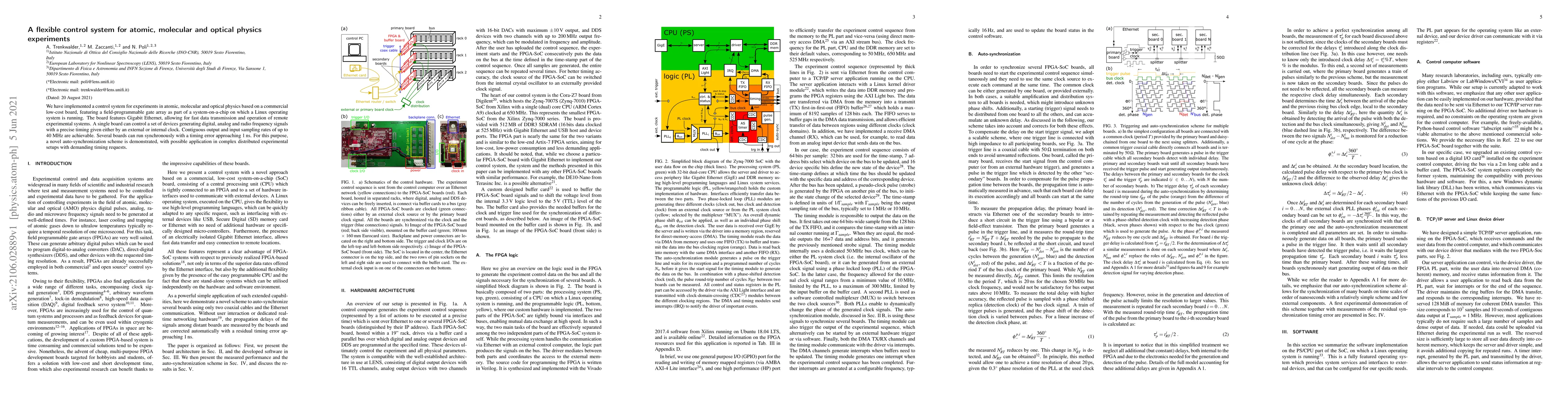 This paper presents a low-cost, flexible control system for atomic, molecular, and optical physics experiments, utilizing a Linux-based FPGA board with Gigabit Ethernet for fast data transmission. The system can synchronize multiple boards with a timing error of nearly 1 ns, enabling precise control over digital, analog, and radio frequency signals.