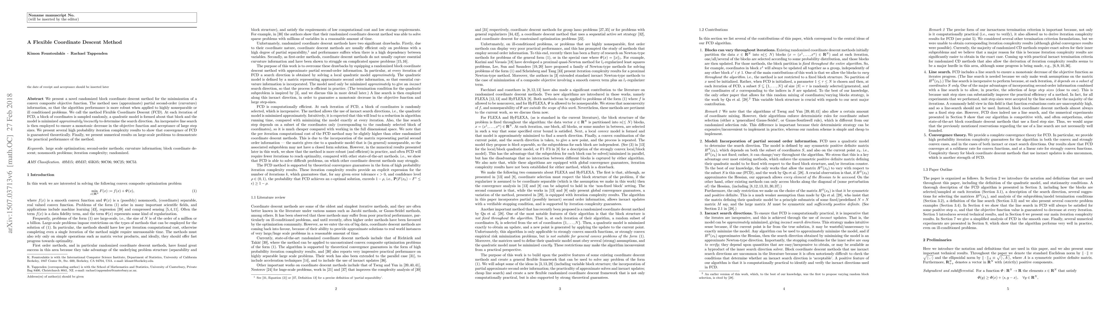 This paper introduces Flexible Coordinate Descent (FCD), a randomized block coordinate descent method for minimizing convex composite objective functions. FCD leverages approximate partial second-order information to improve robustness on nonseparable or ill-conditioned problems, and it guarantees convergence theoretically while demonstrating practical performance on large-scale problems.