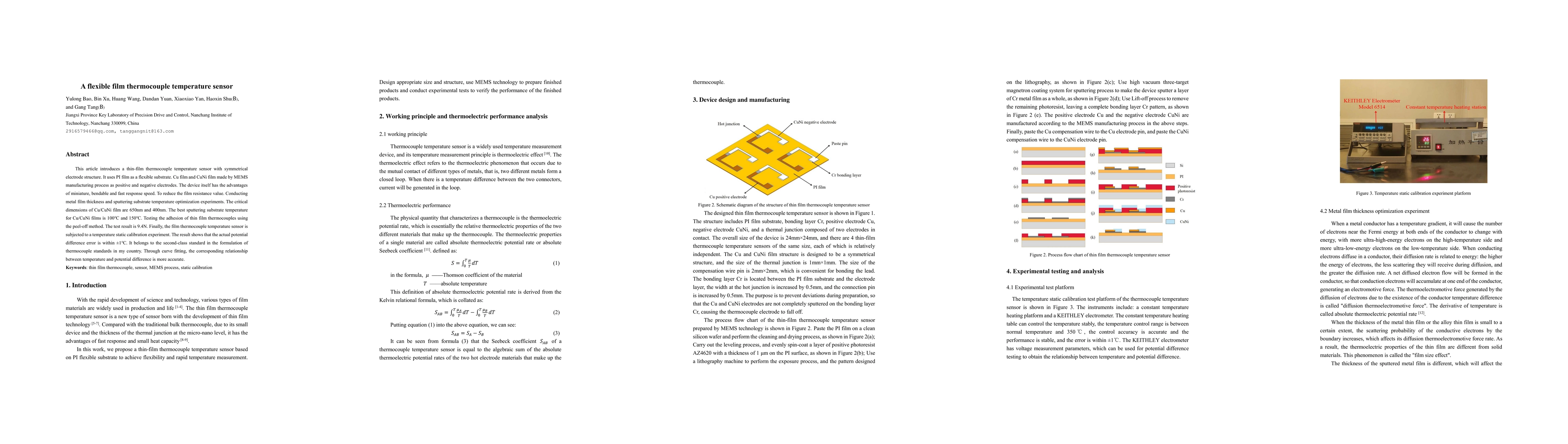 This article introduces a thin-film thermocouple temperature sensor with symmetrical electrode structure. It uses PI film as a flexible substrate. Cu film and CuNi film made by MEMS manufacturing process as positive and negative electrodes. The device itself has the advantages of miniature, bendable and fast response speed. To reduce the film resistance value. Conducting metal film thickness and sputtering substrate temperature optimization experiments. The critical dimensions of Cu/CuNi film are 650nm and 400nm. The best sputtering substrate temperature for Cu/CuNi films is 100 degrees Celsius and 150 degrees Celsius. Testing the adhesion of thin film thermocouples using the peel-off method. The test result is 9.4N. Finally, the film thermocouple temperature sensor is subjected to a temperature static calibration experiment. The result shows that the actual potential difference error is within 1 degrees Celsius. It belongs to the second class standard in the formulation of thermocouple standards in my country. Through curve fitting, the corresponding relationship between temperature and potential difference is more accurate.