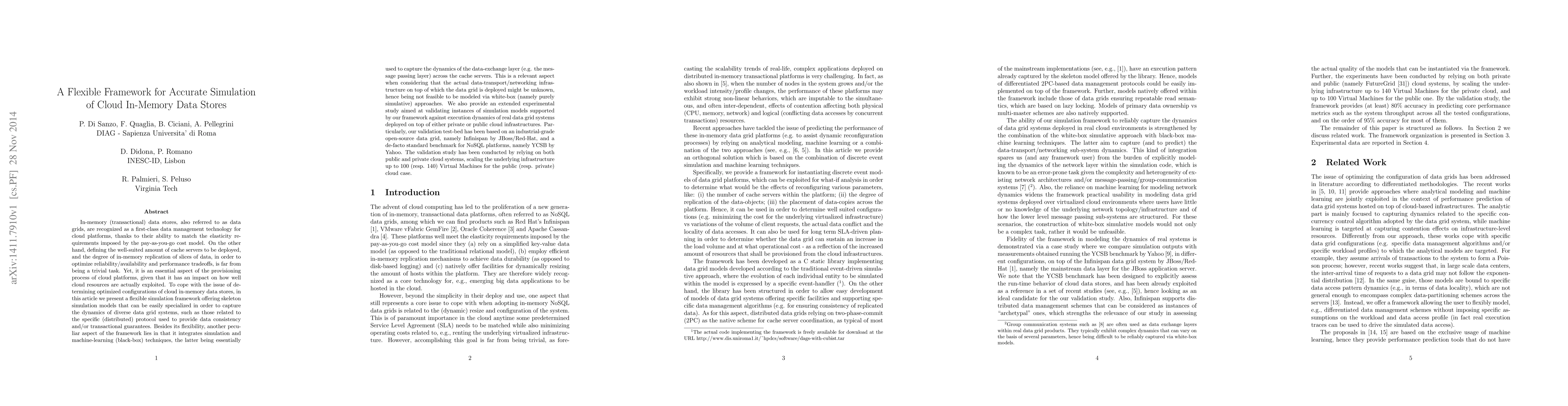 In-memory (transactional) data stores are recognized as a first-class data management technology for cloud platforms, thanks to their ability to match the elasticity requirements imposed by the pay-as-you-go cost model. On the other hand, defining the well-suited amount of cache servers to be deployed, and the degree of in-memory replication of slices of data, in order to optimize reliability/availability and performance tradeoffs, is far from being a trivial task. Yet, it is an essential aspect of the provisioning process of cloud platforms, given that it has an impact on how well cloud resources are actually exploited. To cope with the issue of determining optimized configurations of cloud in-memory data stores, in this article we present a flexible simulation framework offering skeleton simulation models that can be easily specialized in order to capture the dynamics of diverse data grid systems, such as those related to the specific protocol used to provide data consistency and/or transactional guarantees. Besides its flexibility, another peculiar aspect of the framework lies in that it integrates simulation and machine-learning (black-box) techniques, the latter being essentially used to capture the dynamics of the data-exchange layer (e.g. the message passing layer) across the cache servers. This is a relevant aspect when considering that the actual data-transport/networking infrastructure on top of which the data grid is deployed might be unknown, hence being not feasible to be modeled via white-box (namely purely simulative) approaches. We also provide an extended experimental study aimed at validating instances of simulation models supported by our framework against execution dynamics of real data grid systems deployed on top of either private or public cloud infrastructures.