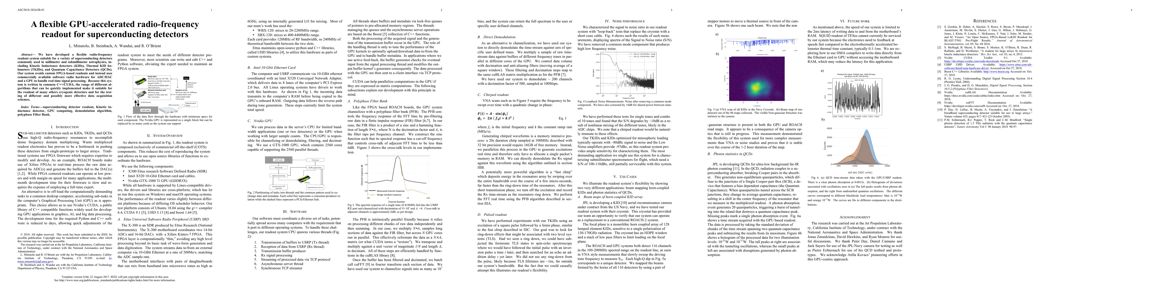 We have developed a flexible radio-frequency readout system suitable for a variety of superconducting detectors commonly used in millimeter and submillimeter astrophysics, including Kinetic Inductance detectors (KIDs), Thermal KID bolometers (TKIDs), and Quantum Capacitance Detectors (QCDs). Our system avoids custom FPGA-based readouts and instead uses commercially available software radio hardware for ADC/DAC and a GPU to handle real time signal processing. Because this system is written in common C++/CUDA, the range of different algorithms that can be quickly implemented make it suitable for the readout of many others cryogenic detectors and for the testing of different and possibly more effective data acquisition schemes.