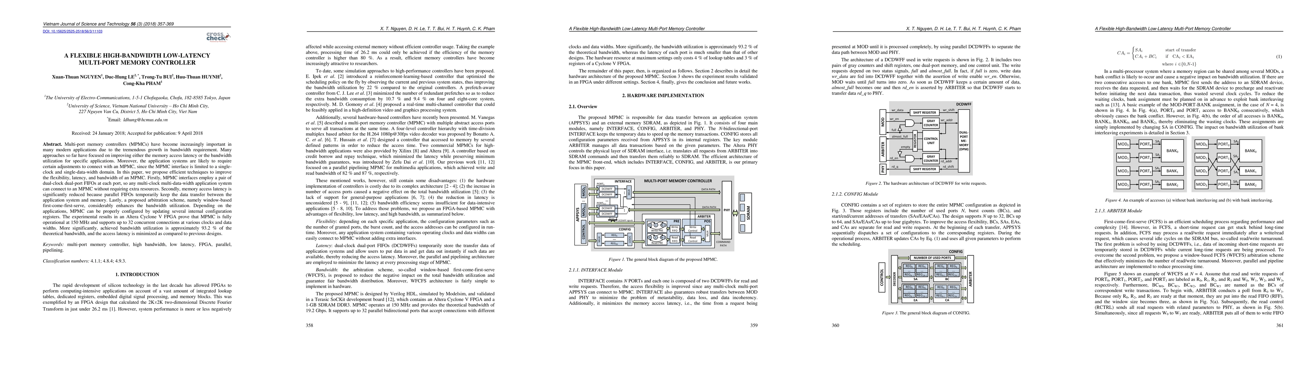 This paper proposes a flexible, high-bandwidth, low-latency multi-port memory controller (MPMC) that employs dual-clock dual-port FIFOs and a window-based arbitration scheme to enhance flexibility, reduce latency, and improve bandwidth utilization. Experimental results show it operates at 150 MHz with 93.2% bandwidth utilization and supports up to 32 concurrent connections.