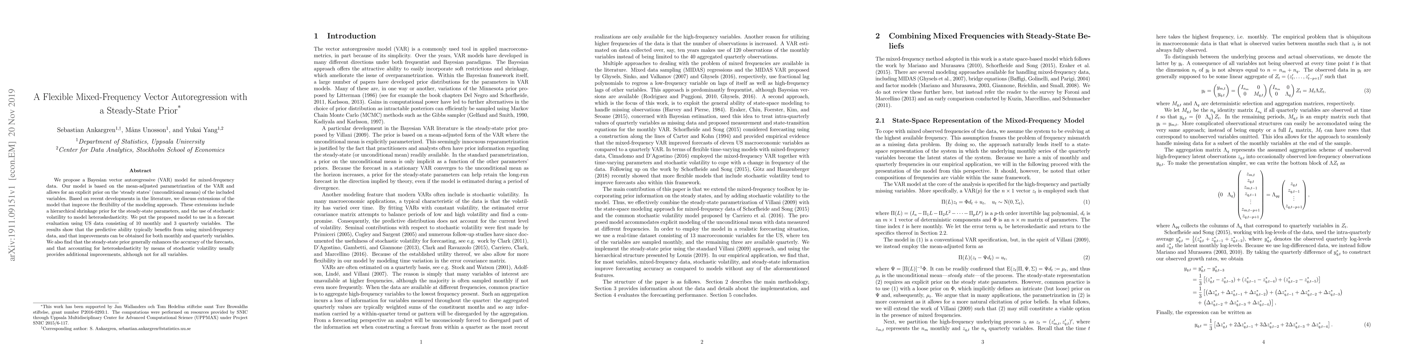 This paper proposes a Bayesian mixed-frequency vector autoregression (VAR) model with a steady-state prior, showing improved predictive ability for mixed-frequency US data. The model incorporates hierarchical shrinkage and stochastic volatility to enhance flexibility, yielding better forecasts for both monthly and quarterly variables.