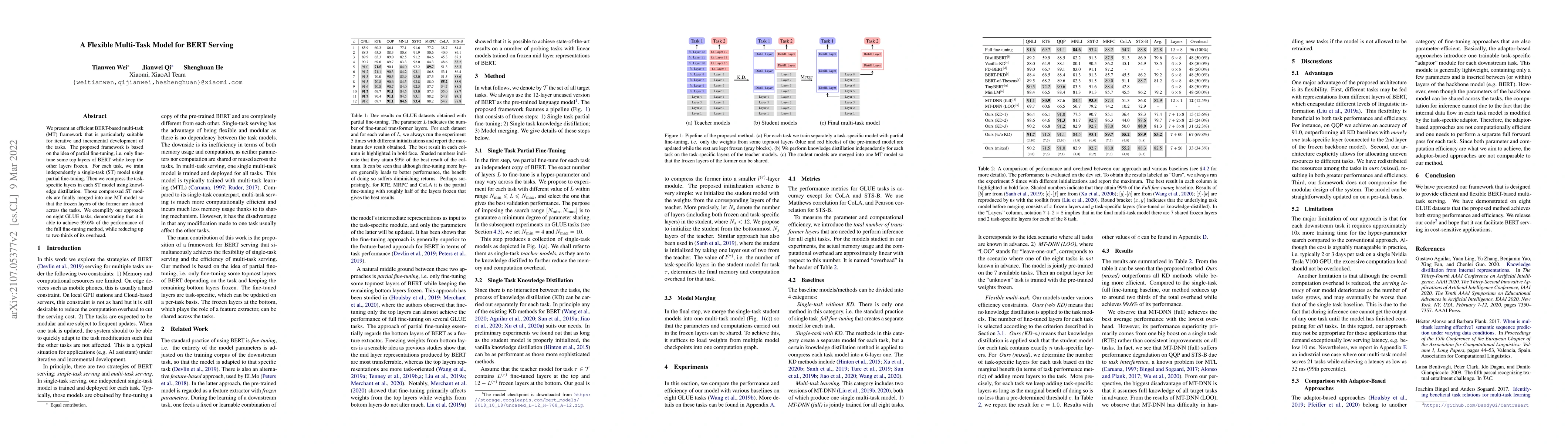 This paper introduces an efficient BERT-based multi-task framework using partial fine-tuning, where only top layers are fine-tuned, and the rest are kept frozen. Task-specific layers are compressed via knowledge distillation and merged into one model, reducing serving costs by 86% on eight GLUE tasks, as demonstrated in XiaoAI, a commercial AI assistant.
