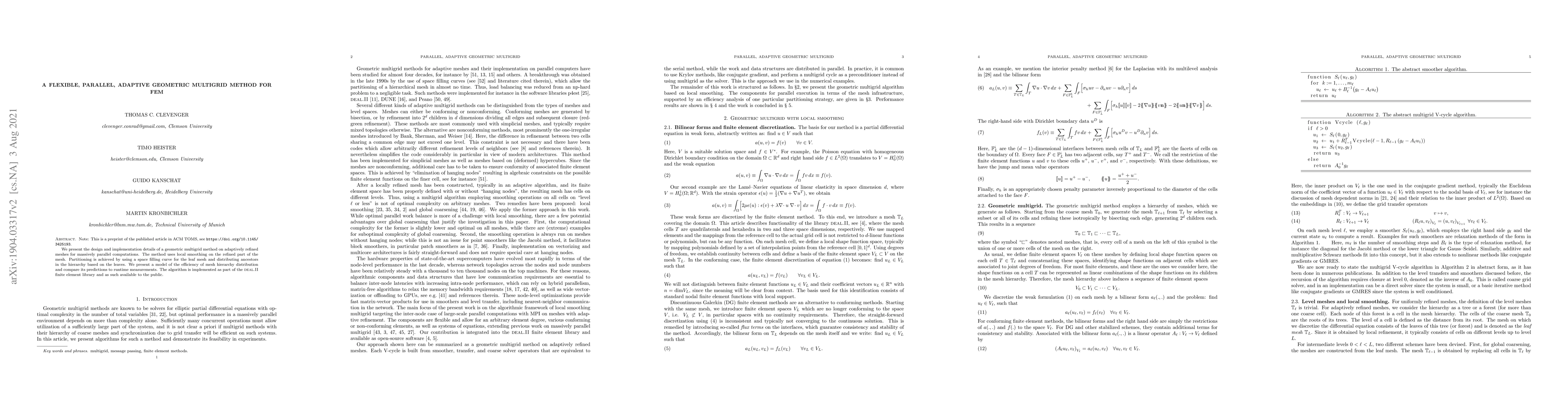 A new method for solving finite element equations using a flexible, parallel, adaptive geometric multigrid approach has been developed, achieving efficient mesh hierarchy distribution and runtime efficiency.