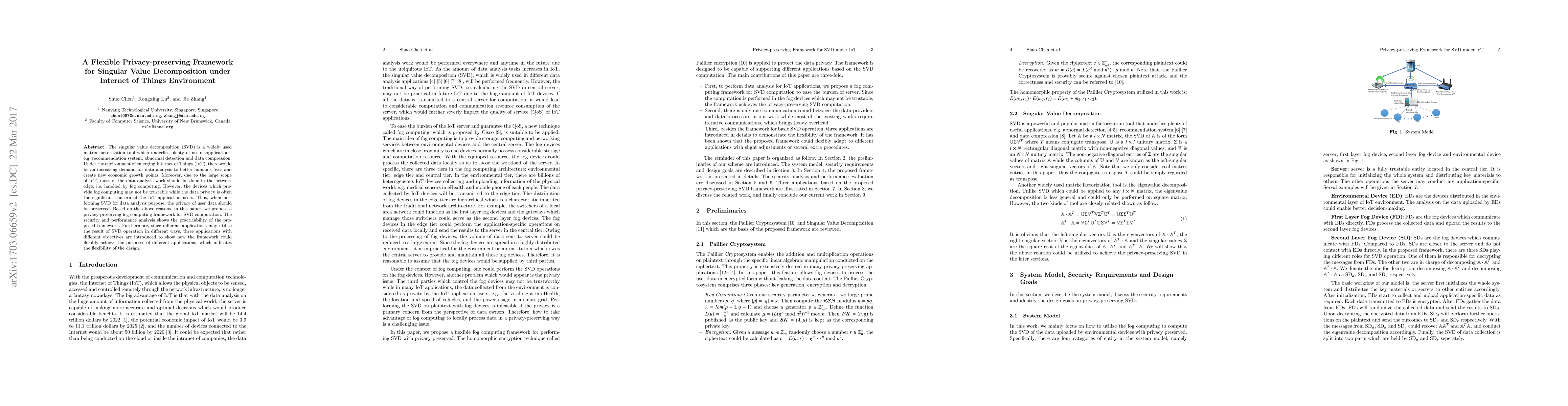 The singular value decomposition (SVD) is a widely used matrix factorization tool which underlies plenty of useful applications, e.g. recommendation system, abnormal detection and data compression. Under the environment of emerging Internet of Things (IoT), there would be an increasing demand for data analysis to better human's lives and create new economic growth points. Moreover, due to the large scope of IoT, most of the data analysis work should be done in the network edge, i.e. handled by fog computing. However, the devices which provide fog computing may not be trustable while the data privacy is often the significant concern of the IoT application users. Thus, when performing SVD for data analysis purpose, the privacy of user data should be preserved. Based on the above reasons, in this paper, we propose a privacy-preserving fog computing framework for SVD computation. The security and performance analysis shows the practicability of the proposed framework. Furthermore, since different applications may utilize the result of SVD operation in different ways, three applications with different objectives are introduced to show how the framework could flexibly achieve the purposes of different applications, which indicates the flexibility of the design.