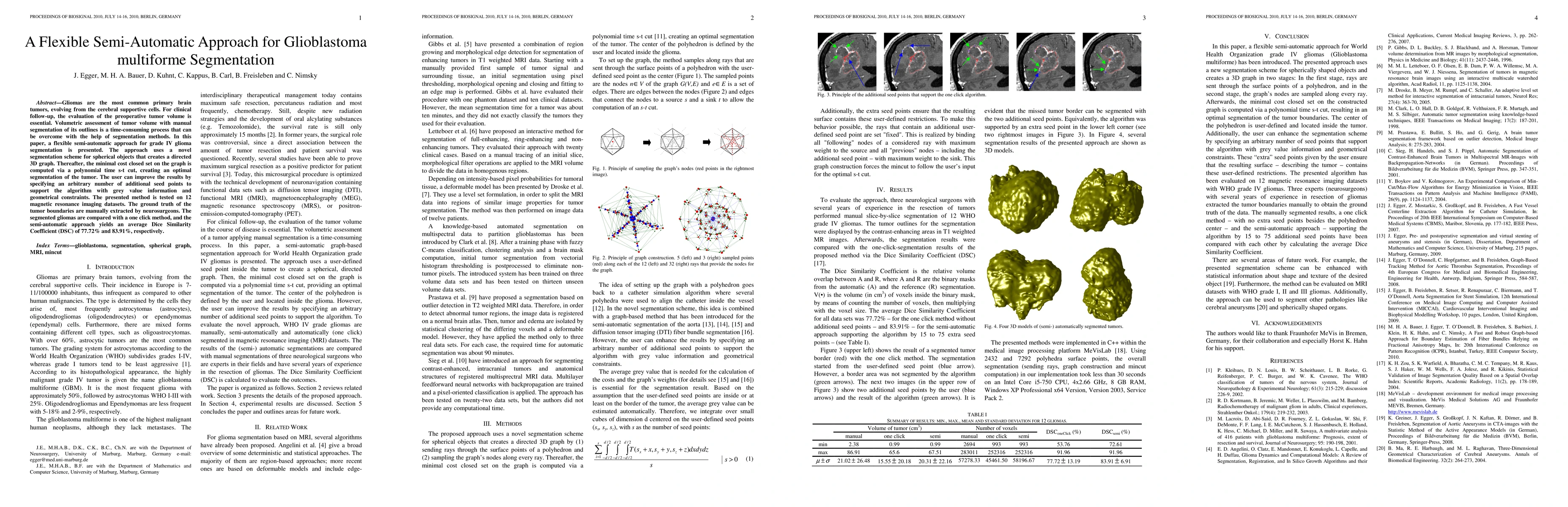 Gliomas are the most common primary brain tumors, evolving from the cerebral supportive cells. For clinical follow-up, the evaluation of the preoperative tumor volume is essential. Volumetric assessment of tumor volume with manual segmentation of its outlines is a time-consuming process that can be overcome with the help of segmentation methods. In this paper, a flexible semi-automatic approach for grade IV glioma segmentation is presented. The approach uses a novel segmentation scheme for spherical objects that creates a directed 3D graph. Thereafter, the minimal cost closed set on the graph is computed via a polynomial time s-t cut, creating an optimal segmentation of the tumor. The user can improve the results by specifying an arbitrary number of additional seed points to support the algorithm with grey value information and geometrical constraints. The presented method is tested on 12 magnetic resonance imaging datasets. The ground truth of the tumor boundaries are manually extracted by neurosurgeons. The segmented gliomas are compared with a one click method, and the semi-automatic approach yields an average Dice Similarity Coefficient (DSC) of 77.72% and 83.91%, respectively.