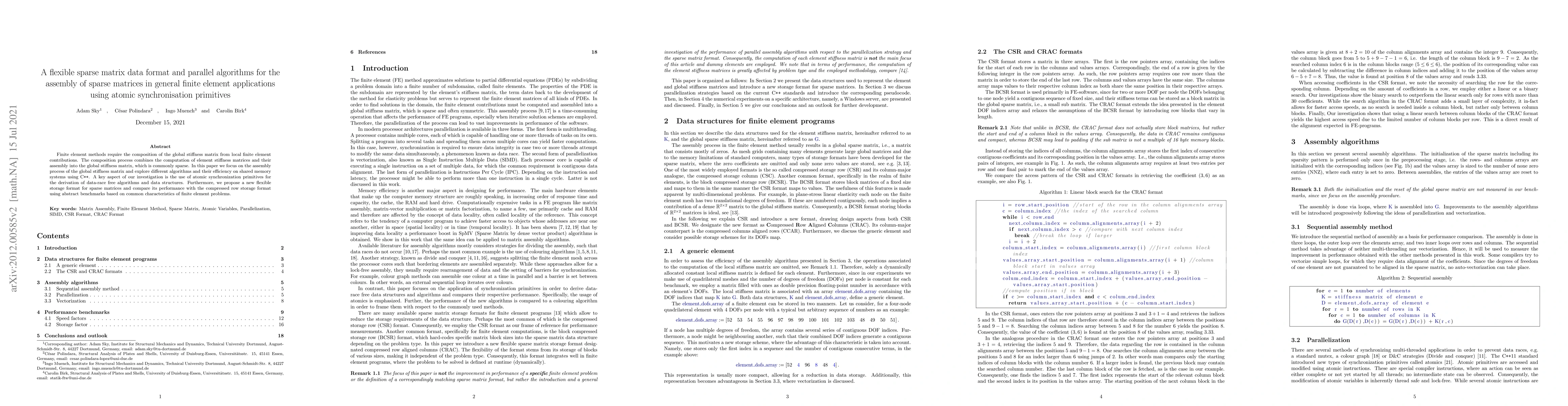 This paper investigates parallel algorithms for assembling sparse global stiffness matrices in finite element methods, focusing on the use of atomic synchronization primitives to avoid data races. It proposes a new flexible sparse matrix data format and compares its performance against the compressed row storage format using benchmarks.