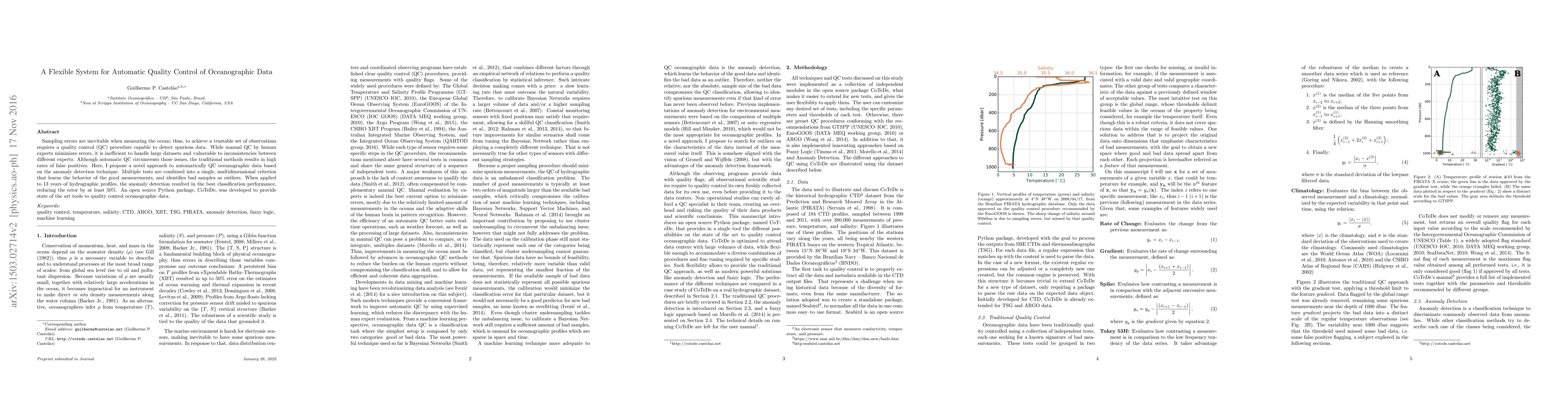 This paper proposes a novel automatic quality control system for oceanographic data using anomaly detection to reduce spurious data errors. The method combines multiple tests into a multidimensional criterion, significantly improving classification performance over traditional methods, reducing errors by at least 50%. An open source Python package, CoTeDe, was developed to implement this approach.