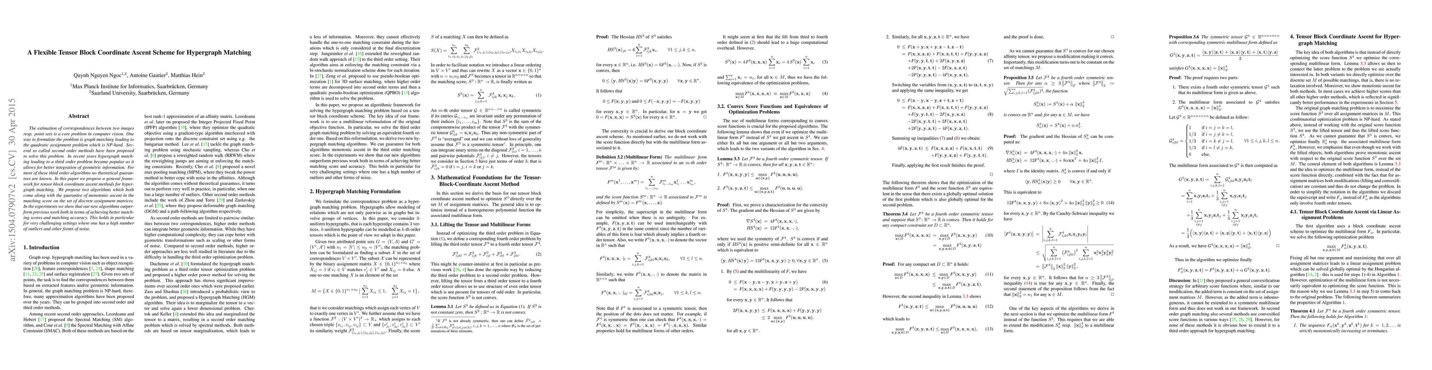 This paper introduces a flexible tensor block coordinate ascent scheme for hypergraph matching, proposing two algorithms that guarantee monotonic improvement in matching scores. Experimental results show superior performance over previous methods, especially in noisy and outlier-rich settings.