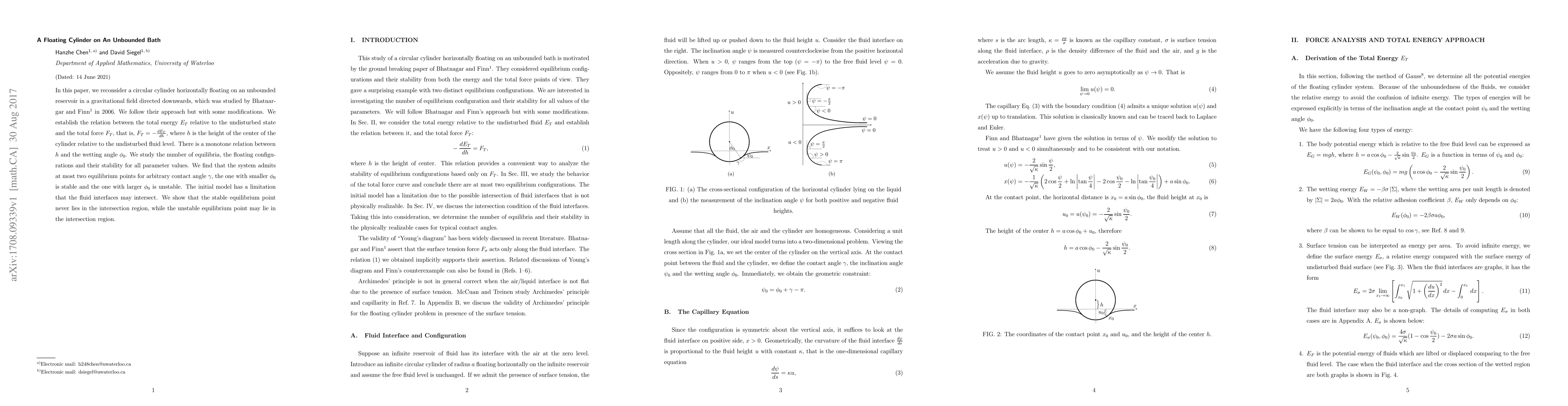 Researchers studied a floating cylinder on an unbounded reservoir, finding that it has at most two stable equilibrium points for different wetting angles, with one being stable and the other unstable.