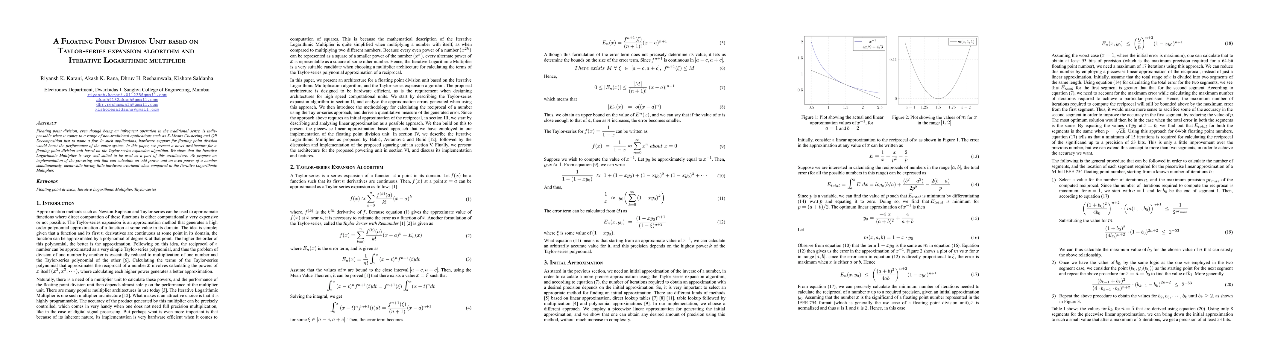 This paper introduces a novel floating point division unit architecture based on Taylor-series expansion and an Iterative Logarithmic Multiplier. It proposes an efficient powering unit to calculate both odd and even powers simultaneously with minimal hardware overhead.