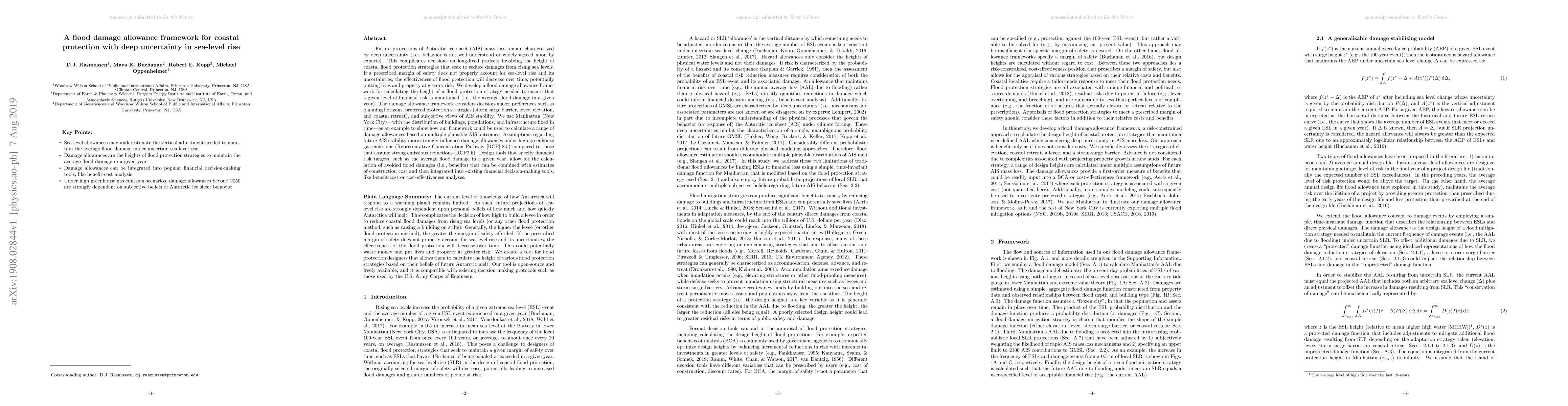 This paper develops a framework to calculate flood protection heights for coastal areas under deep uncertainty in sea-level rise due to Antarctic ice sheet mass loss. The framework considers decision-maker preferences and uses New York City as an example to demonstrate how it can account for various AIS outcomes and greenhouse gas emission scenarios.