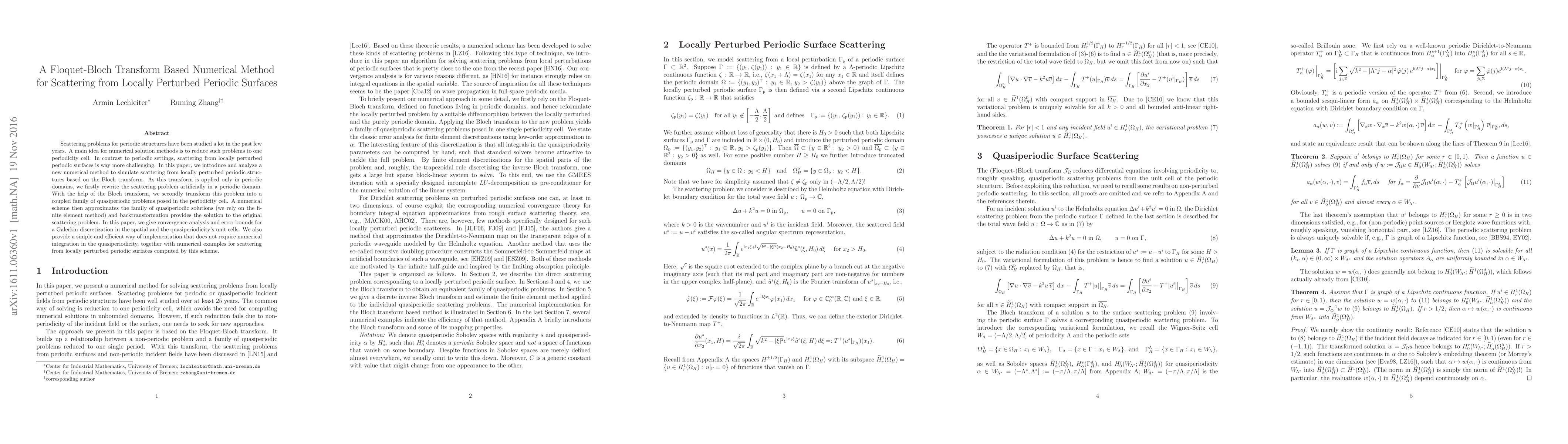 This paper introduces a new Floquet-Bloch transform based numerical method for simulating scattering from locally perturbed periodic surfaces. The method transforms the problem into a coupled family of quasiperiodic problems in a periodic cell, approximates these using the finite element method, and provides convergence analysis and error bounds.