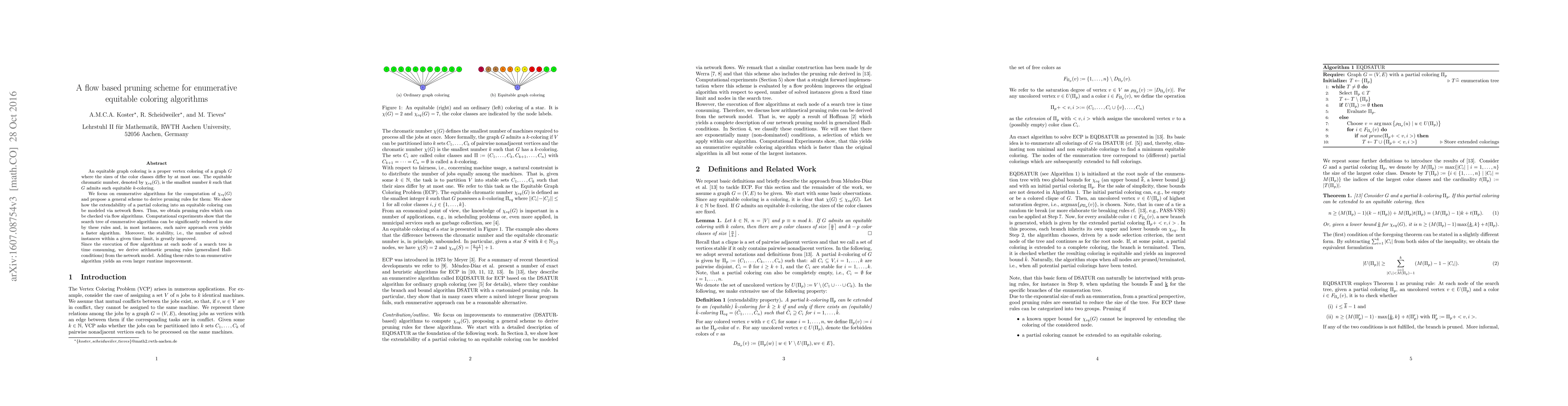 An equitable graph coloring is a proper vertex coloring of a graph G where the sizes of the color classes differ by at most one. The equitable chromatic number is the smallest number k such that G admits such equitable k-coloring. We focus on enumerative algorithms for the computation of the equitable coloring number and propose a general scheme to derive pruning rules for them: We show how the extendability of a partial coloring into an equitable coloring can be modeled via network flows. Thus, we obtain pruning rules which can be checked via flow algorithms. Computational experiments show that the search tree of enumerative algorithms can be significantly reduced in size by these rules and, in most instances, such naive approach even yields a faster algorithm. Moreover, the stability, i.e., the number of solved instances within a given time limit, is greatly improved. Since the execution of flow algorithms at each node of a search tree is time consuming, we derive arithmetic pruning rules (generalized Hall-conditions) from the network model. Adding these rules to an enumerative algorithm yields an even larger runtime improvement.