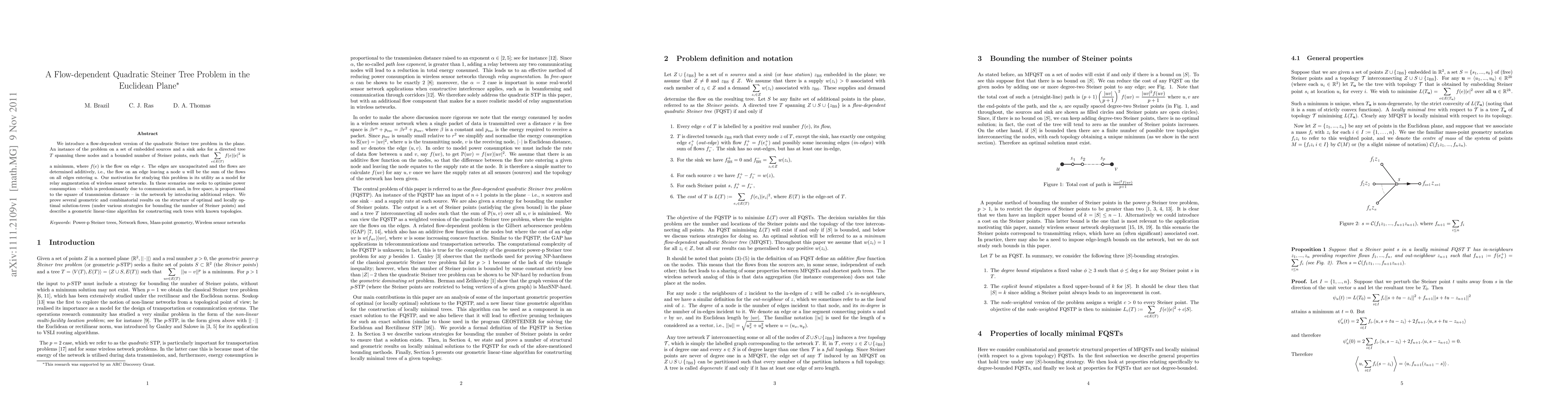 We introduce a flow-dependent version of the quadratic Steiner tree problem in the plane. An instance of the problem on a set of embedded sources and a sink asks for a directed tree $T$ spanning these nodes and a bounded number of Steiner points, such that $\displaystyle\sum_{e \in E(T)}f(e)|e|^2$ is a minimum, where $f(e)$ is the flow on edge $e$. The edges are uncapacitated and the flows are determined additively, i.e., the flow on an edge leaving a node $u$ will be the sum of the flows on all edges entering $u$. Our motivation for studying this problem is its utility as a model for relay augmentation of wireless sensor networks. In these scenarios one seeks to optimise power consumption -- which is predominantly due to communication and, in free space, is proportional to the square of transmission distance -- in the network by introducing additional relays. We prove several geometric and combinatorial results on the structure of optimal and locally optimal solution-trees (under various strategies for bounding the number of Steiner points) and describe a geometric linear-time algorithm for constructing such trees with known topologies.
