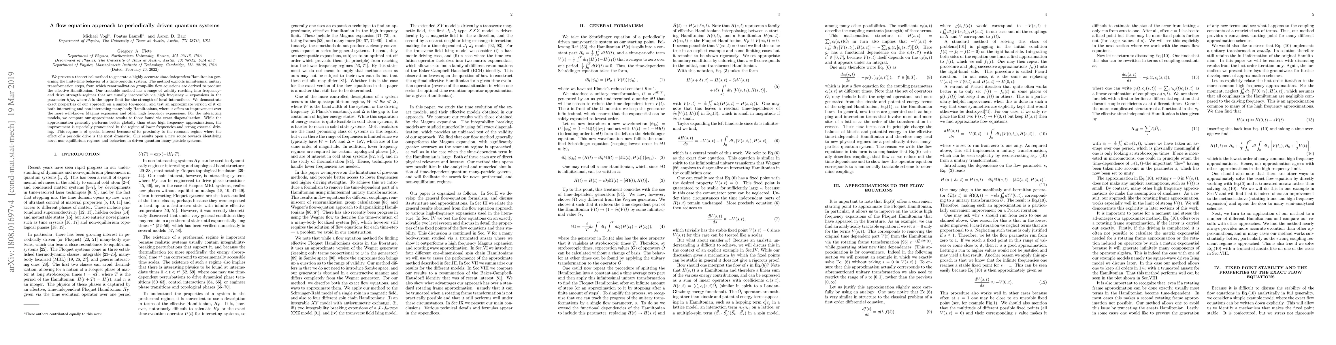 We present a theoretical method to generate a highly accurate {\em time-independent} Hamiltonian governing the finite-time behavior of a time-periodic system. The method exploits infinitesimal unitary transformation steps, from which renormalization group-like flow equations are derived to produce the effective Hamiltonian. Our tractable method has a range of validity reaching into frequency regimes that are usually inaccessible via high frequency $\omega$ expansions in the parameter $h/\omega$, where $h$ is the upper limit for the strength of local interactions. We demonstrate our approach on both interacting and non-interacting many-body Hamiltonians where it offers an improvement over the more well-known Magnus expansion and other high frequency expansions. For the interacting models, we compare our approximate results to those found via exact diagonalization. While the approximation generally performs better globally than other high frequency approximations, the improvement is especially pronounced in the regime of lower frequencies and strong external driving. This regime is of special interest because of its proximity to the resonant regime where the effect of a periodic drive is the most dramatic. Our results open a new route towards identifying novel non-equilibrium regimes and behaviors in driven quantum many-particle systems.