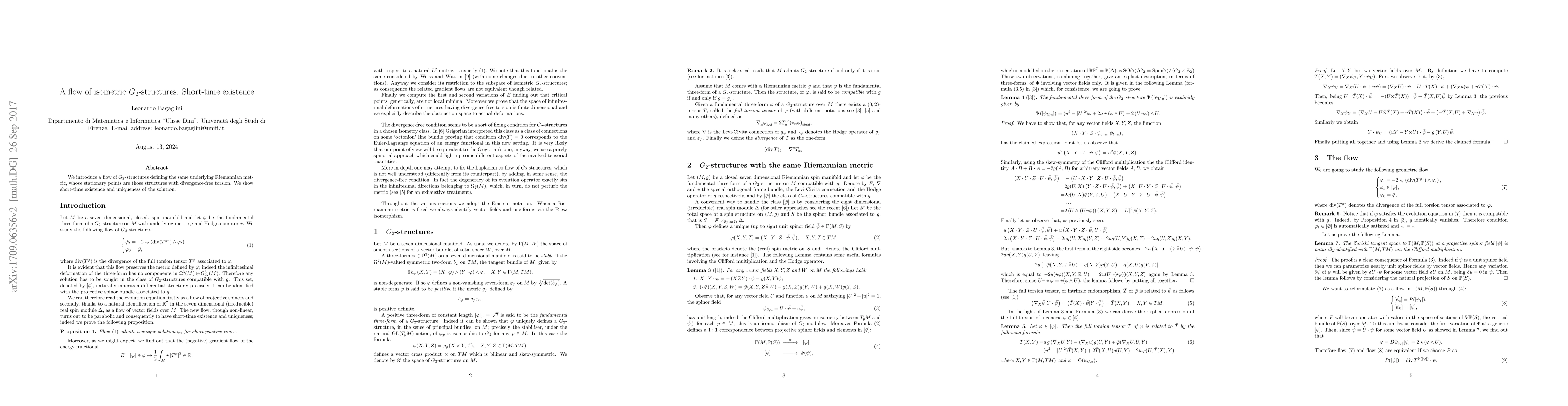 This paper introduces a flow for $G_2$-structures on a fixed Riemannian metric, where stationary points correspond to structures with divergence-free torsion. The authors demonstrate short-time existence and uniqueness of the solution to this flow.