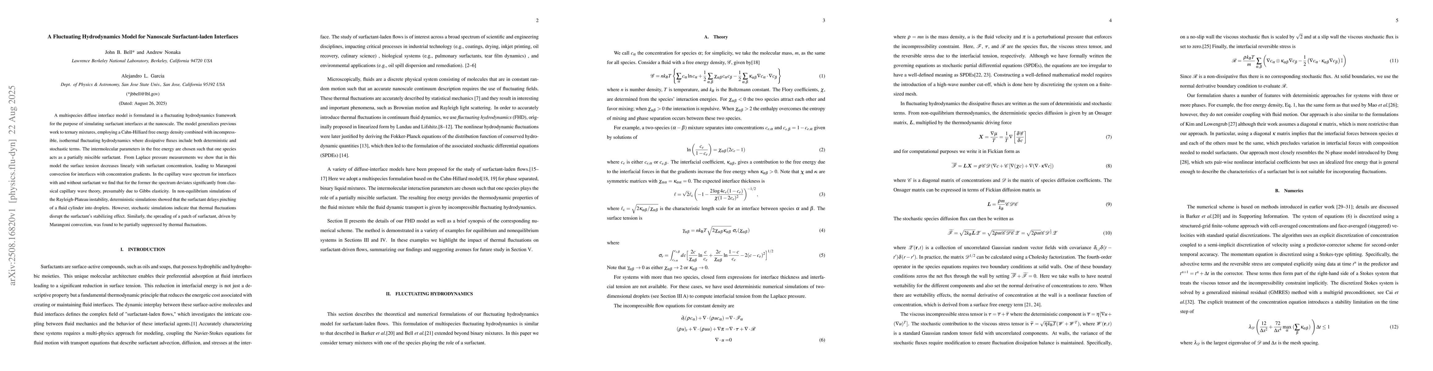 A multispecies diffuse interface model is formulated in a fluctuating hydrodynamics framework for the purpose of simulating surfactant interfaces at the nanoscale. The model generalizes previous work to ternary mixtures, employing a Cahn-Hilliard free energy density combined with incompressible, isothermal fluctuating hydrodynamics where dissipative fluxes include both deterministic and stochastic terms. The intermolecular parameters in the free energy are chosen such that one species acts as a partially miscible surfactant. From Laplace pressure measurements we show that in this model the surface tension decreases linearly with surfactant concentration, leading to Marangoni convection for interfaces with concentration gradients. In the capillary wave spectrum for interfaces with and without surfactant we find that for the former the spectrum deviates significantly from classical capillary wave theory, presumably due to Gibbs elasticity. In non-equilibrium simulations of the Rayleigh-Plateau instability, deterministic simulations showed that the surfactant delays pinching of a fluid cylinder into droplets. However, stochastic simulations indicate that thermal fluctuations disrupt the surfactant's stabilizing effect. Similarly, the spreading of a patch of surfactant, driven by Marangoni convection, was found to be partially suppressed by thermal fluctuations.