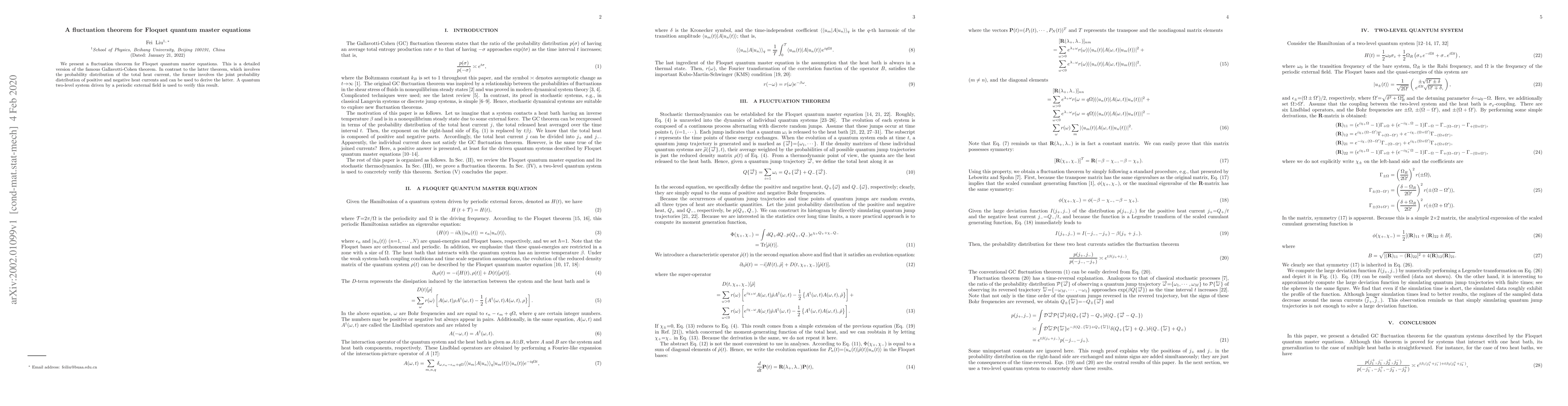 This paper introduces a fluctuation theorem for Floquet quantum master equations, extending the Gallavotti-Cohen theorem to the joint probability distribution of positive and negative heat currents in a quantum two-level system driven by a periodic field, thereby verifying the theorem's applicability.